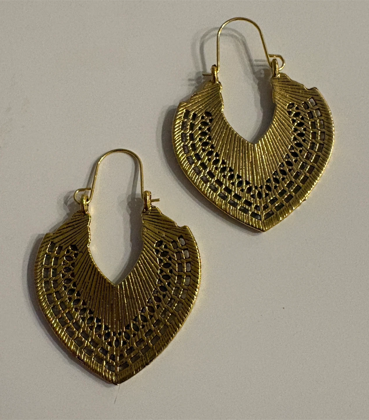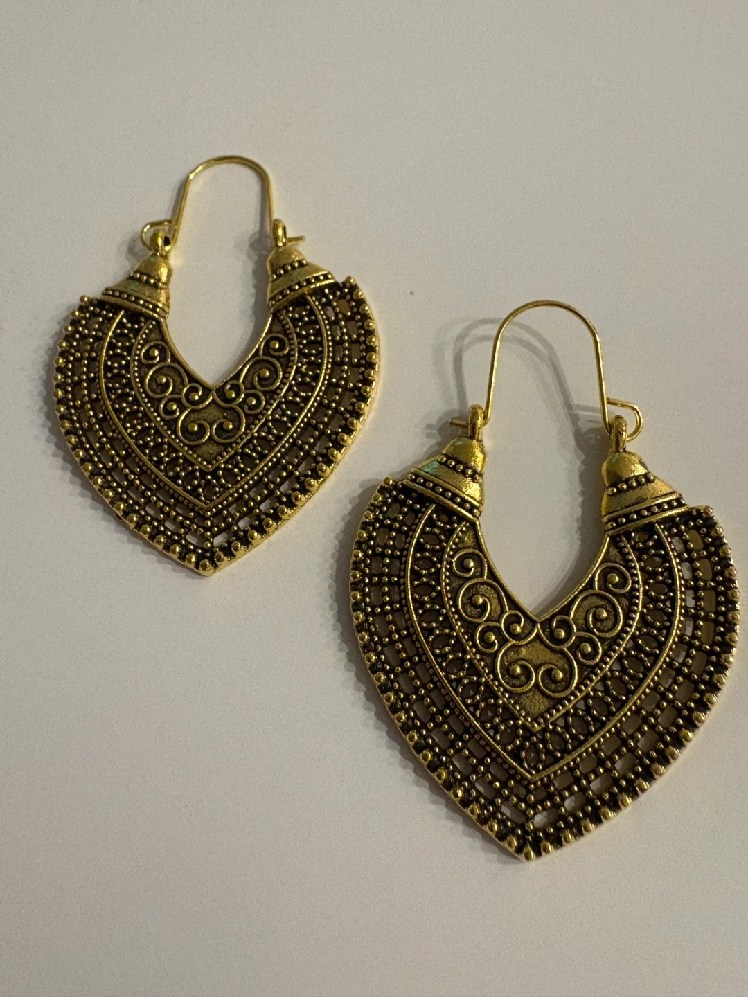 These gold-toned hoop earrings feature an intricate heart-shaped filigree design. They have a hook closure and are made of metal. These would be a lovely addition to an outfit for a special occasion!