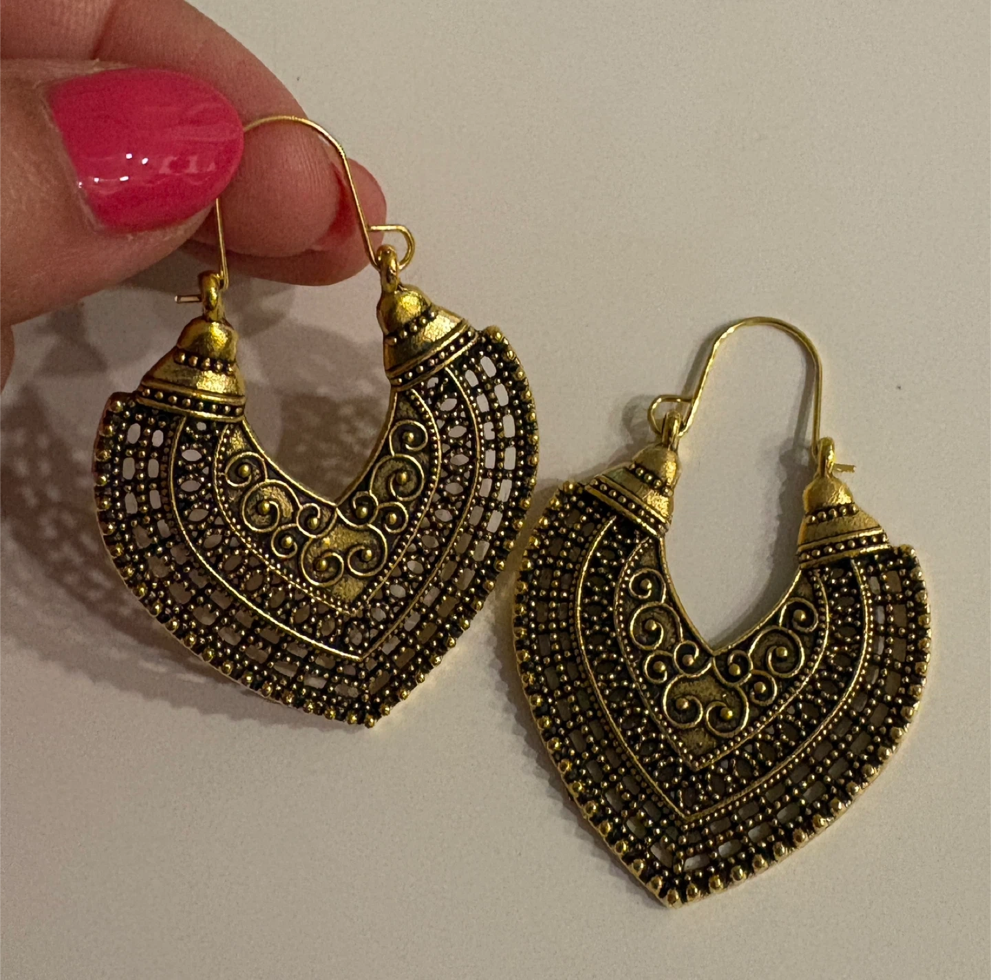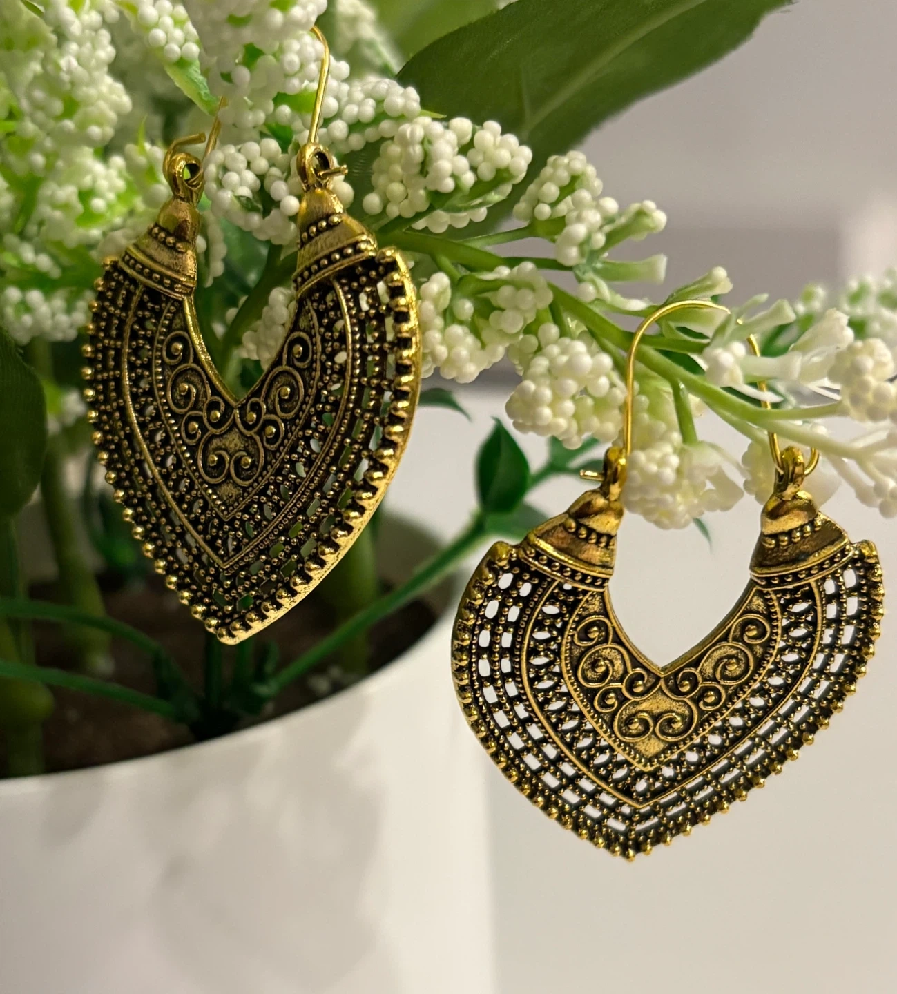 These gold-toned hoop earrings feature an intricate heart-shaped filigree design. They have a hook closure and are made of metal. These would be a lovely addition to an outfit for a special occasion!