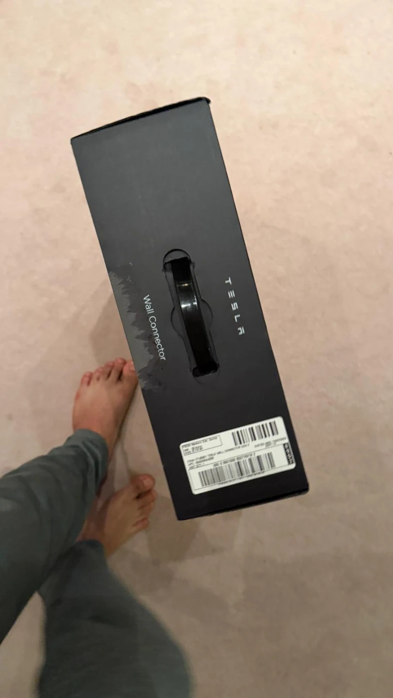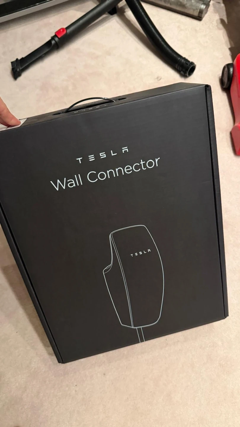 Tesla Wall Connector hardwired electric vehicle charger. It's 24 feet long and white. This charger offers up to 48A charging speed. Includes the original box.
