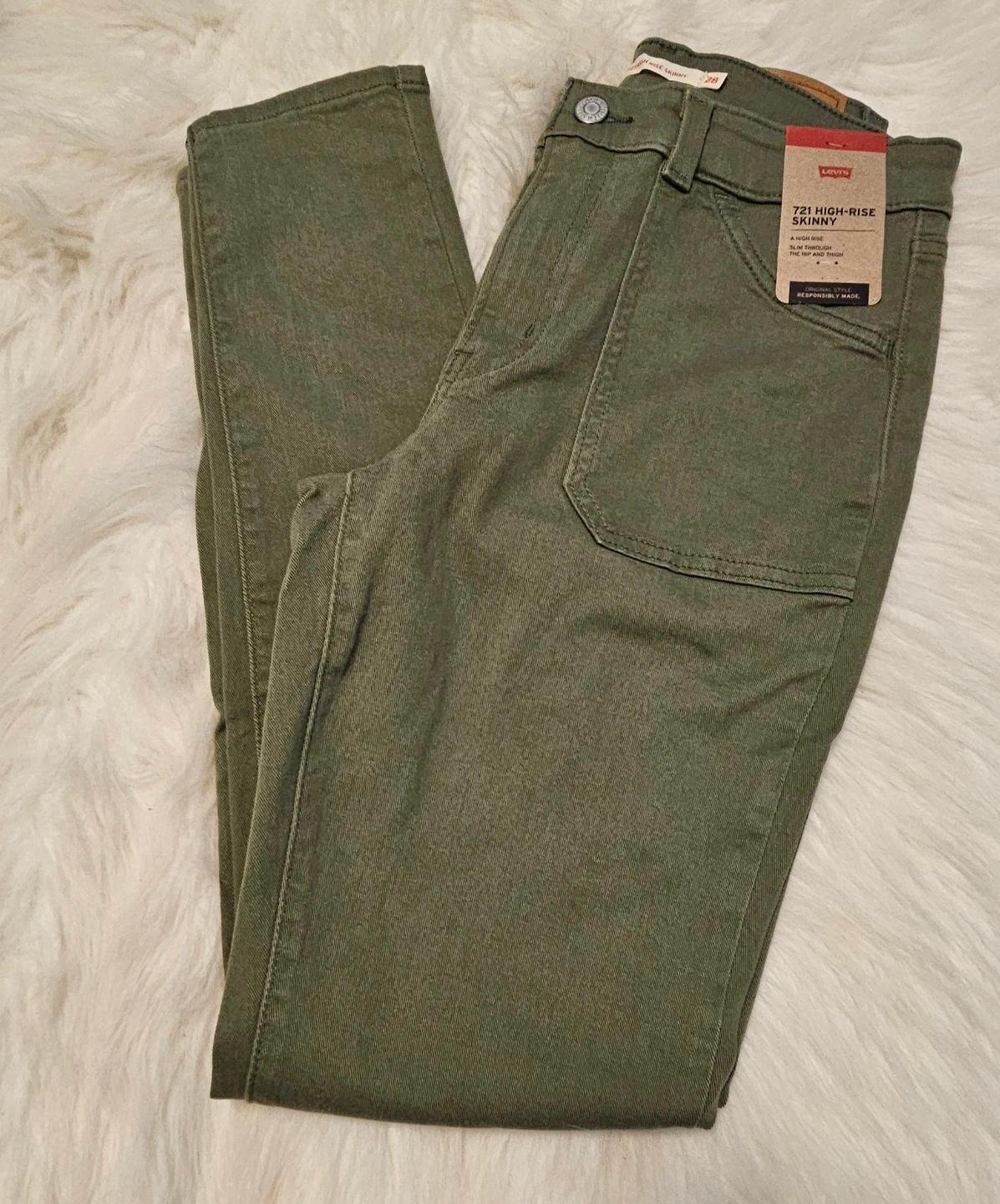 These are Levi's 721 high-rise skinny jeans in an olive green colour. They're a size 28x30 with a classic five-pocket design and zip fly. These jeans are made from a durable fabric blend.