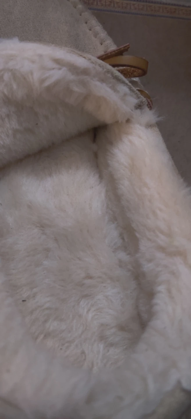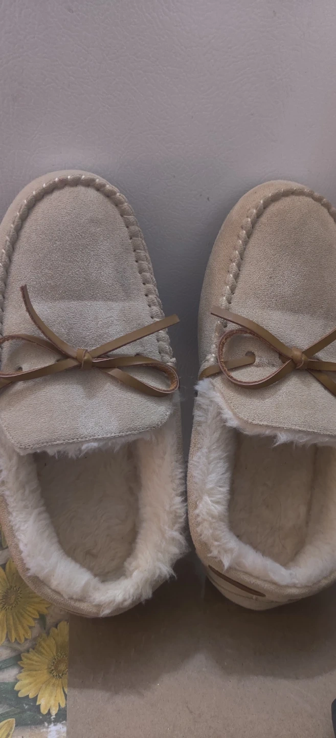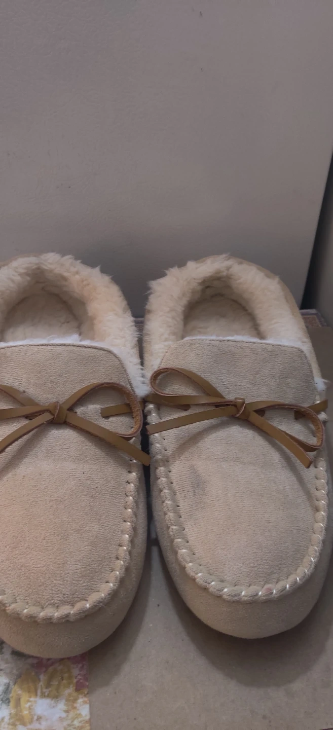 Comfy moccasin leather slippers in a tan suede-like material. They're lined with soft, warm faux fur for cozy feet. The durable rubber sole has a cloud pattern.mildley worn .