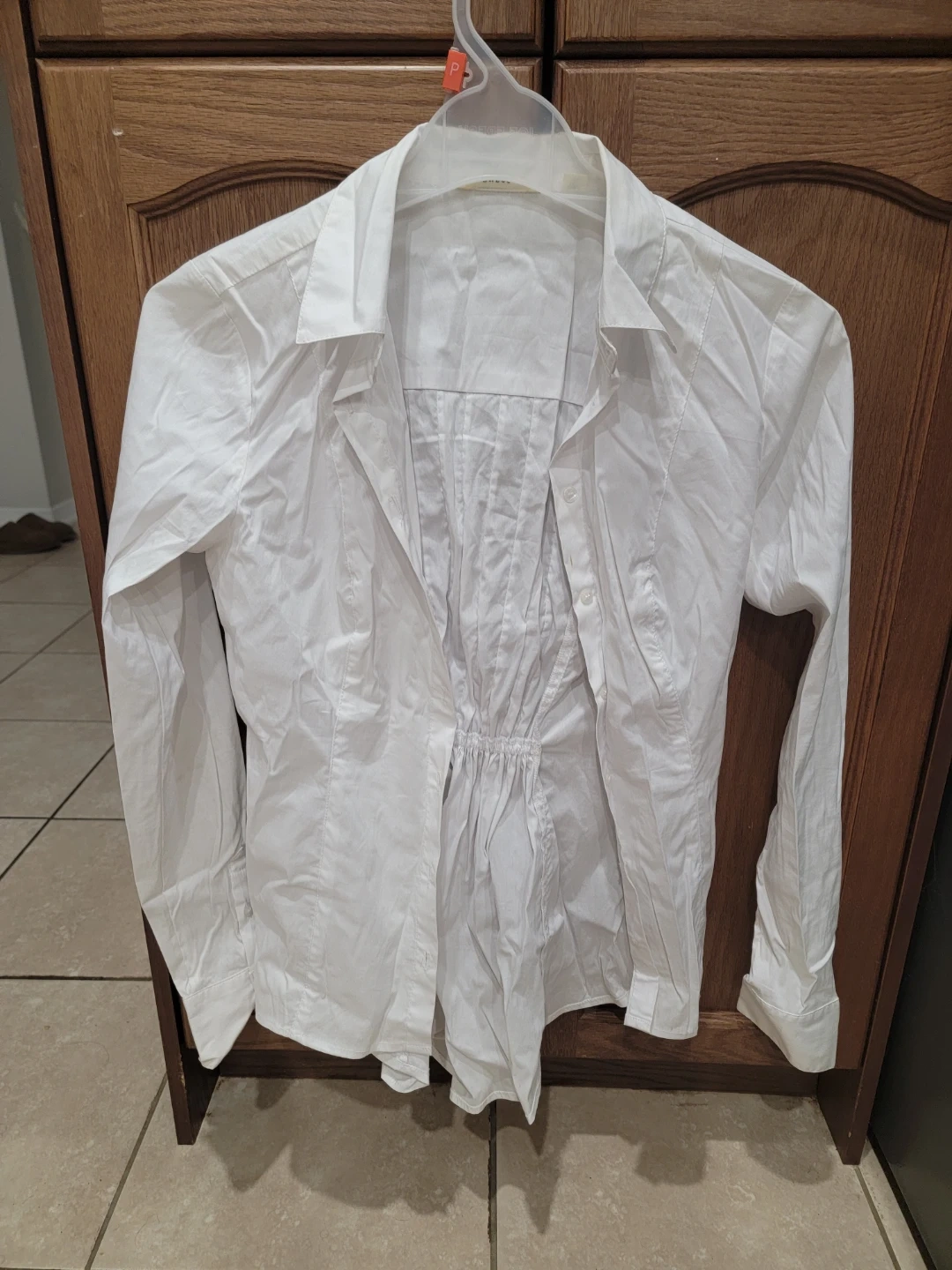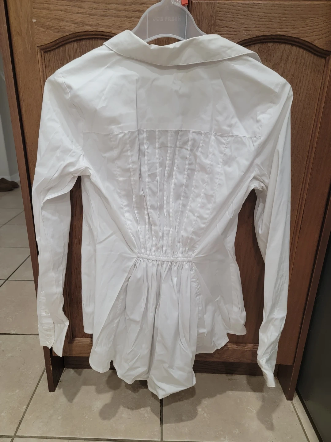 A crisp white button-up shirt with a collared neckline and long sleeves. It features a gathered elastic waist detail for a fitted look. This shirt is great for layering or wearing on its own.