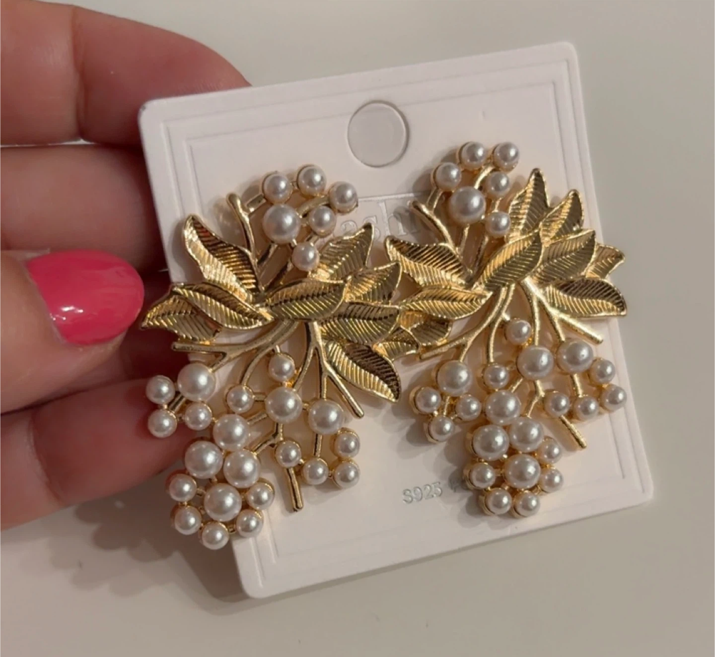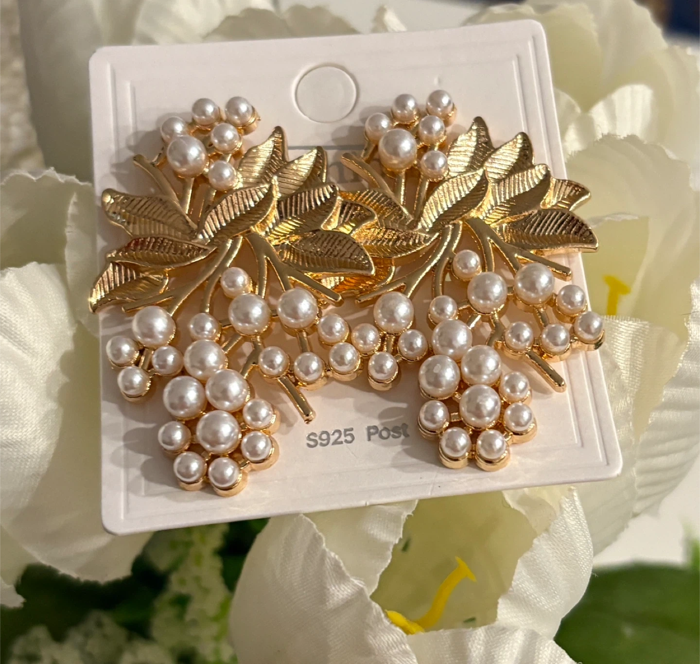 Gorgeous Gold-tone earrings with a detailed leaf design and clusters of faux pearls. They're a lovely statement piece!