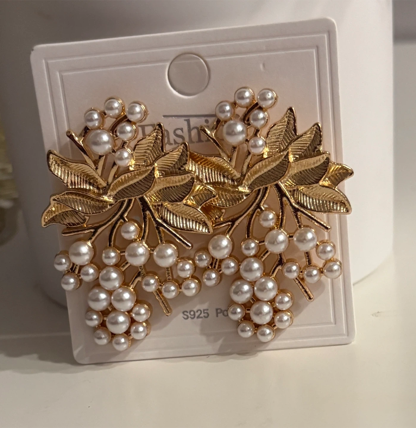 Gorgeous Gold-tone earrings with a detailed leaf design and clusters of faux pearls. They're a lovely statement piece!