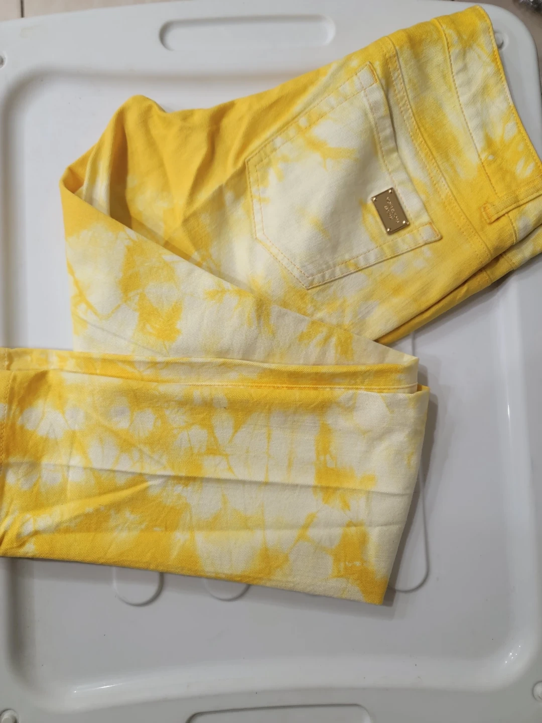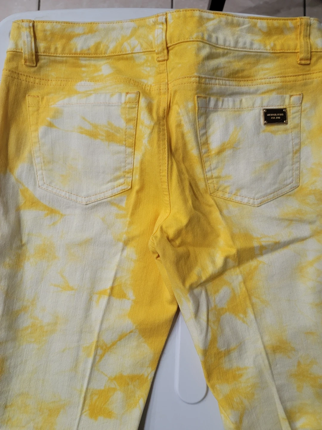 These Michael Kors jeans have a bright yellow and white tie-dye pattern. They're made from denim. This style is great for adding a pop of colour to your outfit!
