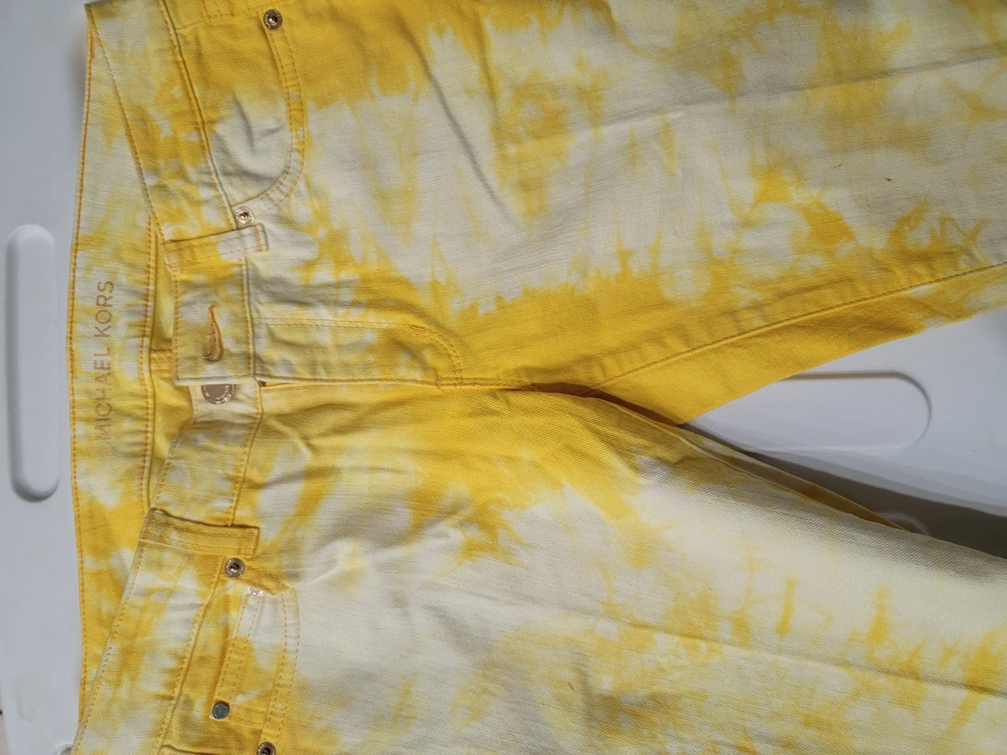 These Michael Kors jeans have a bright yellow and white tie-dye pattern. They're made from denim. This style is great for adding a pop of colour to your outfit!