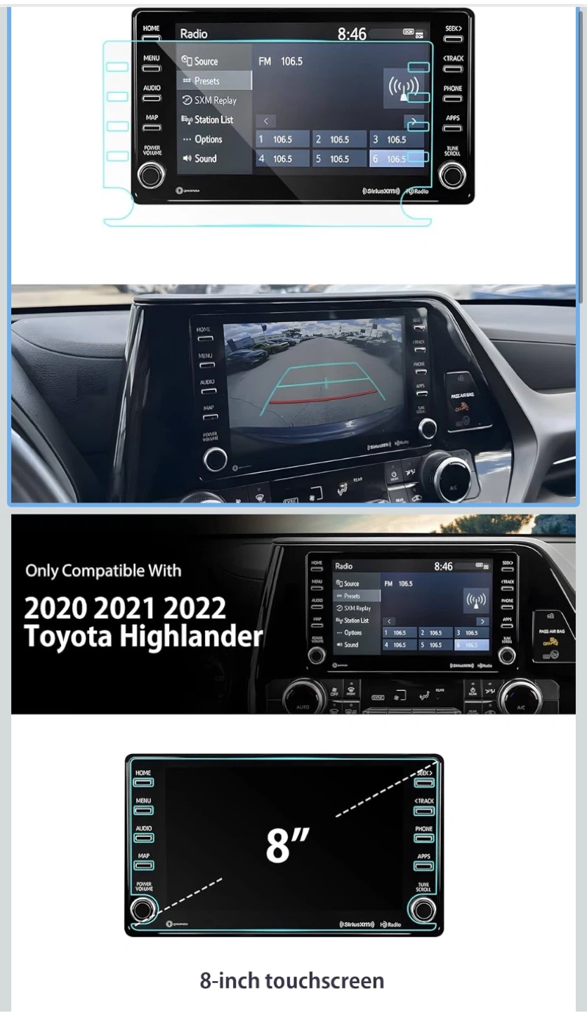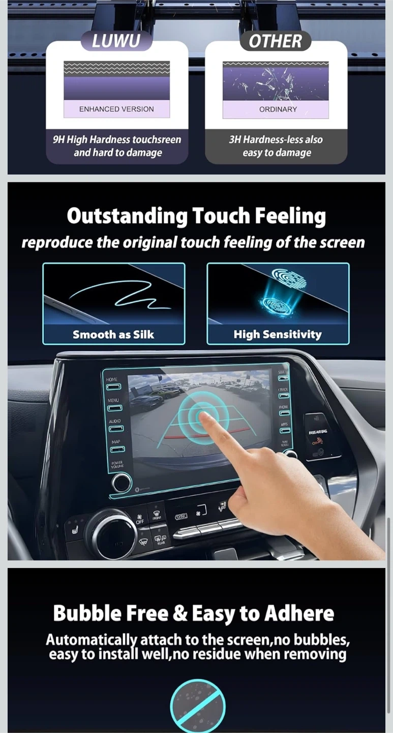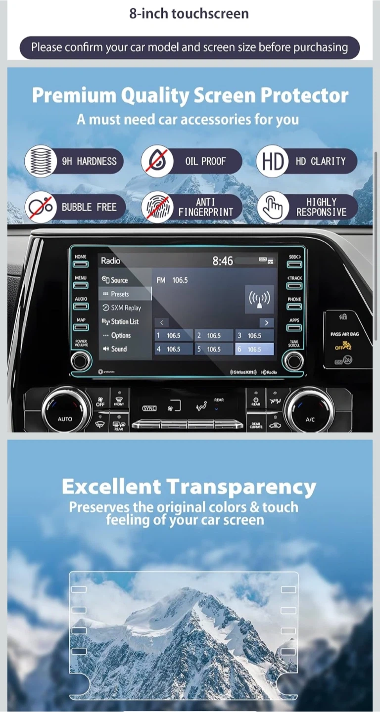 This premium quality screen protector offers 9H hardness, is oil and fingerprint proof, and maintains high HD clarity. It's bubble-free and easy to adhere, ensuring a smooth touch feeling. Protects your 8-inch touchscreen from scratches and damage.