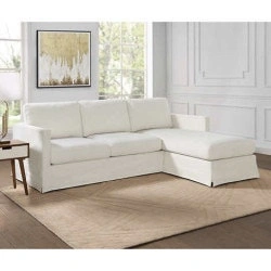 This is a beautiful white sofa with a chaise lounge, perfect for relaxing after a long day. It's very comfy and has plenty of room to stretch out. Colour: White, Material: Fabric, Style: Modern, Orientation: Left-Hand Facing. I’ve had a sofa cover on it, so it's well protected and looks very new!