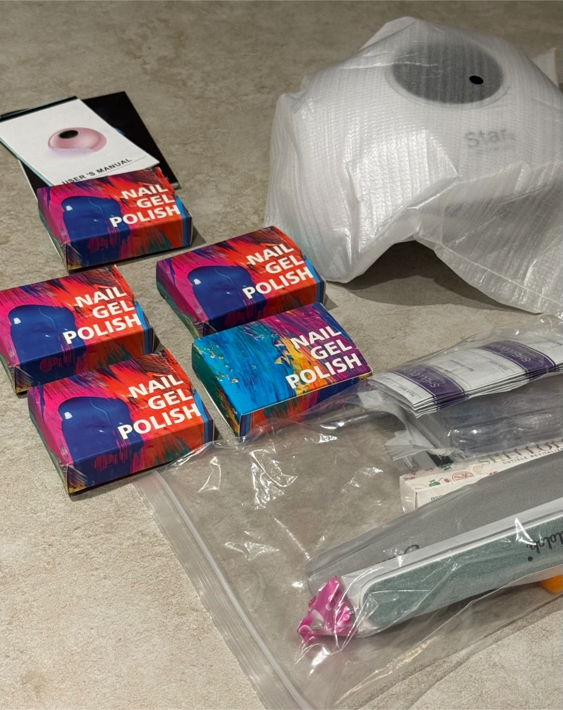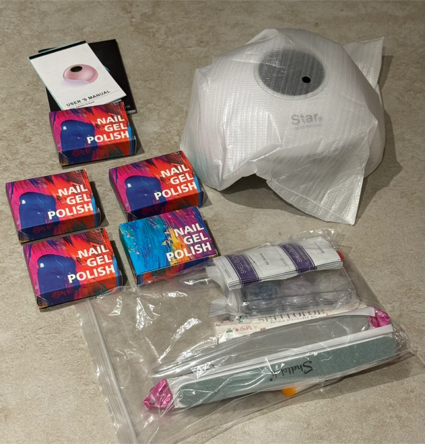 This new Shelloloh gel polish set includes a UV/LED lamp, several bottles of gel polish, nail files, and other accessories.