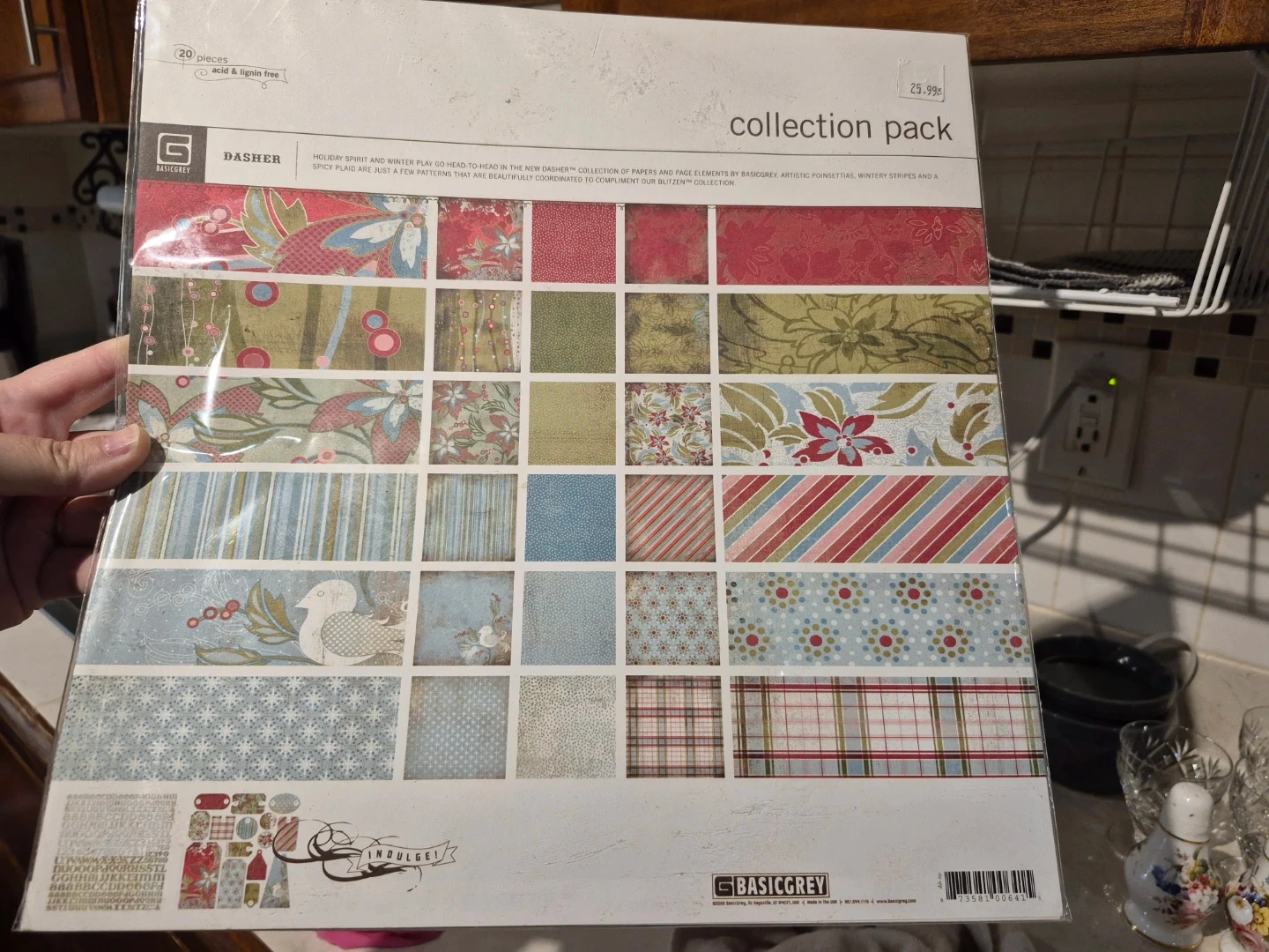 This pack includes 20 pieces of acid and lignin-free paper from the BasicGrey Dasher collection. Features holiday and winter-themed patterns with artistic poinsettias and stripes.