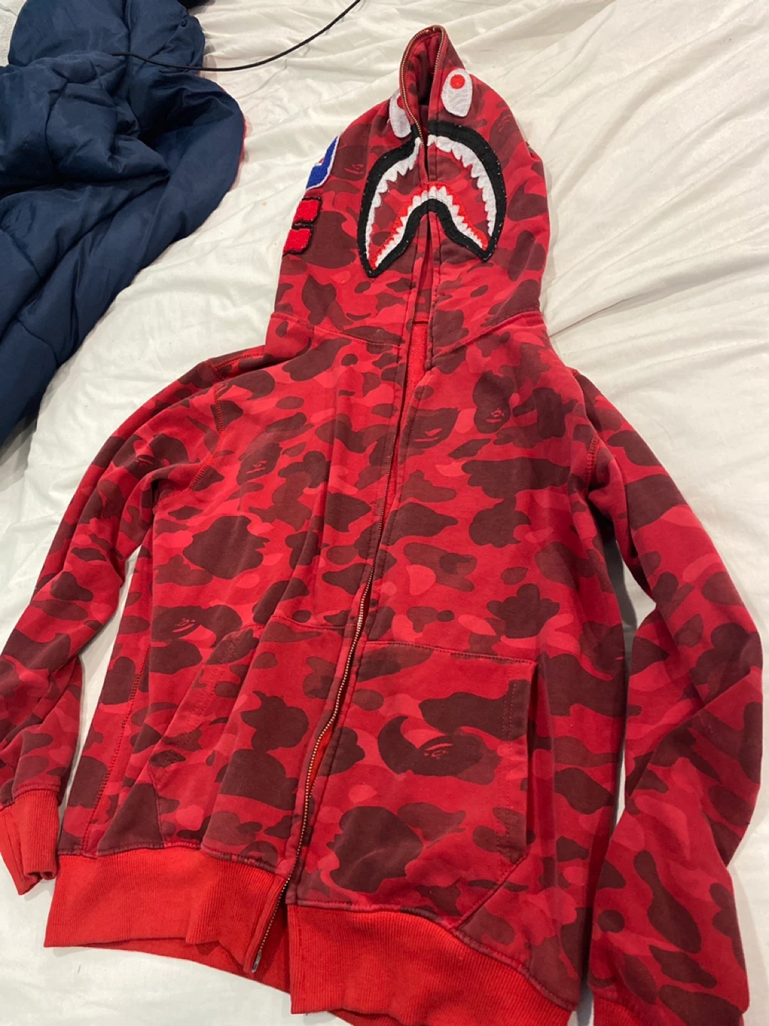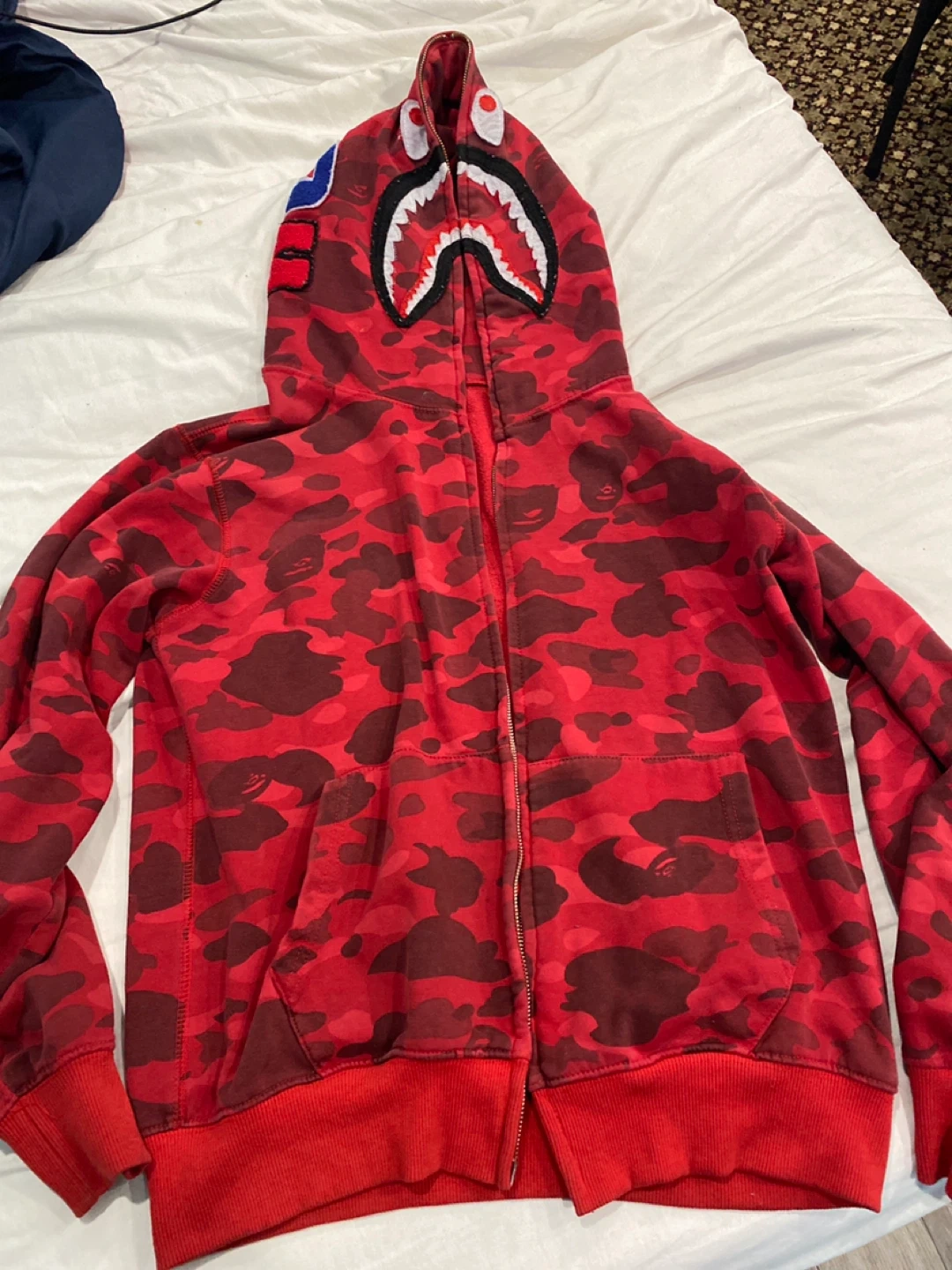 This is a BAPE Shark full zip hoodie in red camouflage. It features the iconic shark graphic on the hood. Made with a comfortable cotton blend. This bape is 100% real