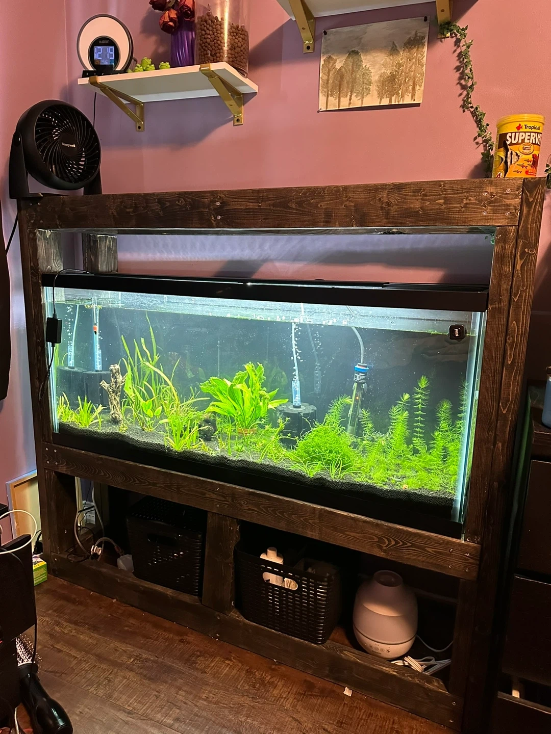 A spacious aquarium tank set on a dark wood stand. It's fully set up with live plants and substrate. It comes with the sponge filters and air pump, fully set up.