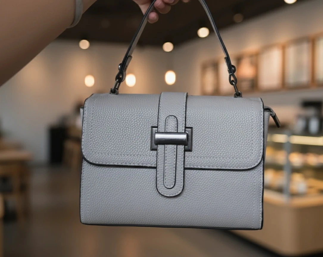 This stylish shoulder bag is a lovely light grey colour with a textured finish. It features a secure buckle closure and a detachable strap. A versatile accessory for any occasion!