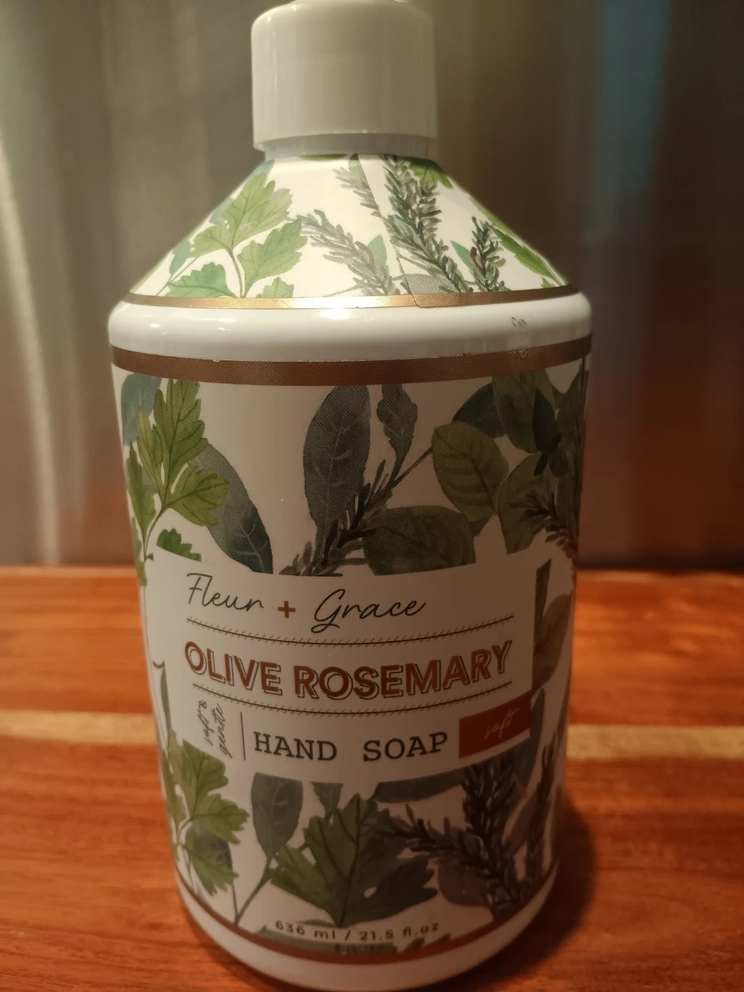 Fleur + Grace Olive Rosemary Hand Soap. Bottle size is 636 ml / 21.5 fl oz. Gentle and soft formula.