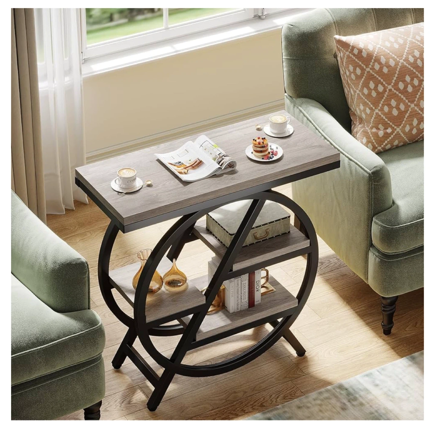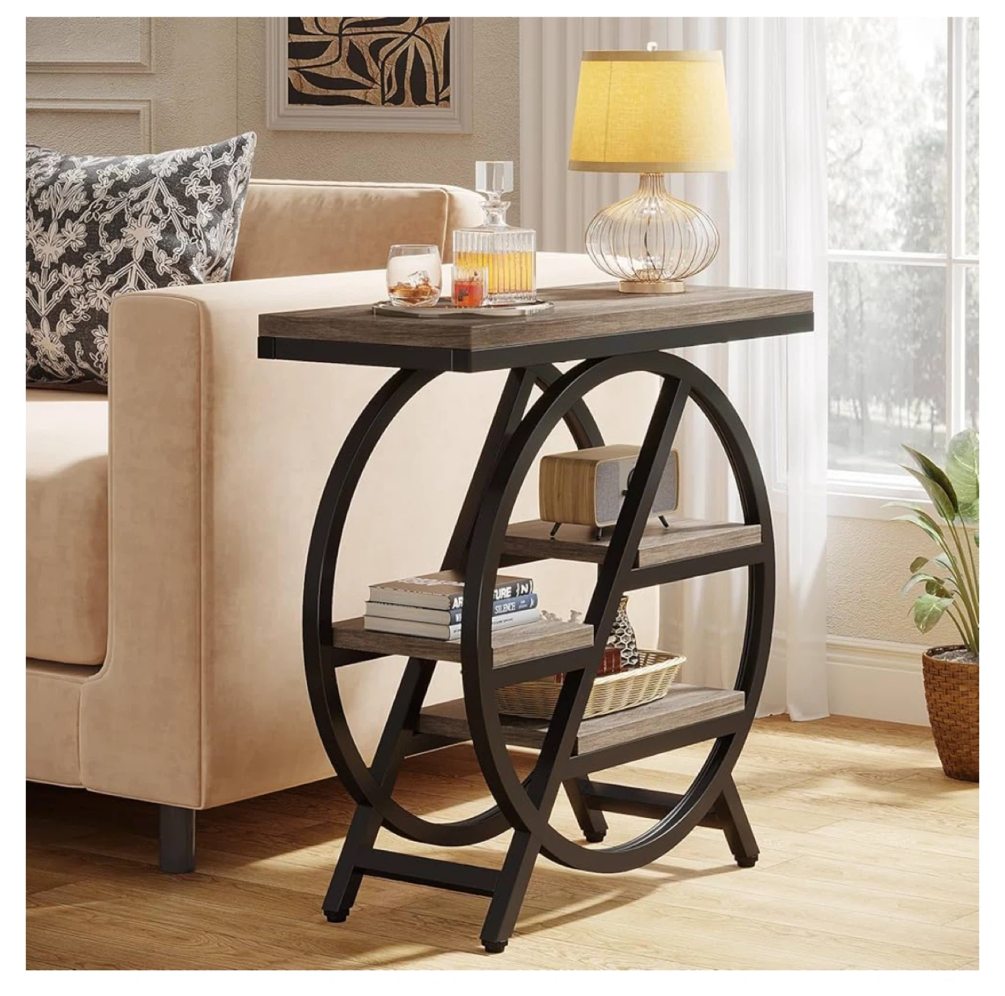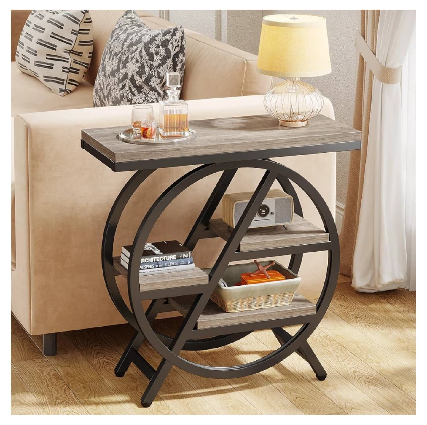 This side table features a rustic wood top with a black metal frame and two shelves. Its unique circular design adds a modern industrial touch to any room. Dimensions: 25.59" W x 11.81" D x 26.18" H. Shelf dimensions: 14.57" x 10.83", 7.48" x 6.69". This piece is handy for storing books or decorative items beside a sofa or chair.