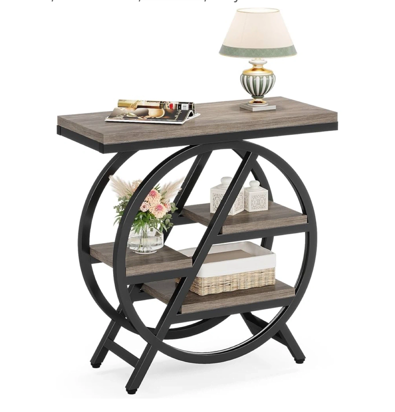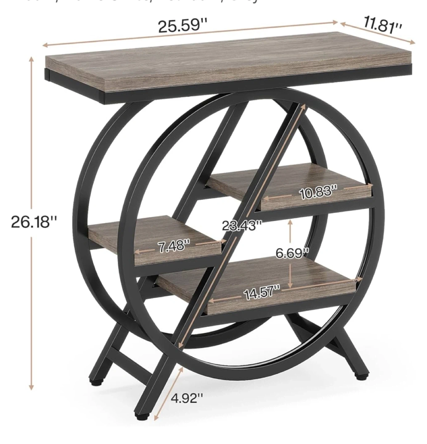 This side table features a rustic wood top with a black metal frame and two shelves. Its unique circular design adds a modern industrial touch to any room. Dimensions: 25.59" W x 11.81" D x 26.18" H. Shelf dimensions: 14.57" x 10.83", 7.48" x 6.69". This piece is handy for storing books or decorative items beside a sofa or chair.