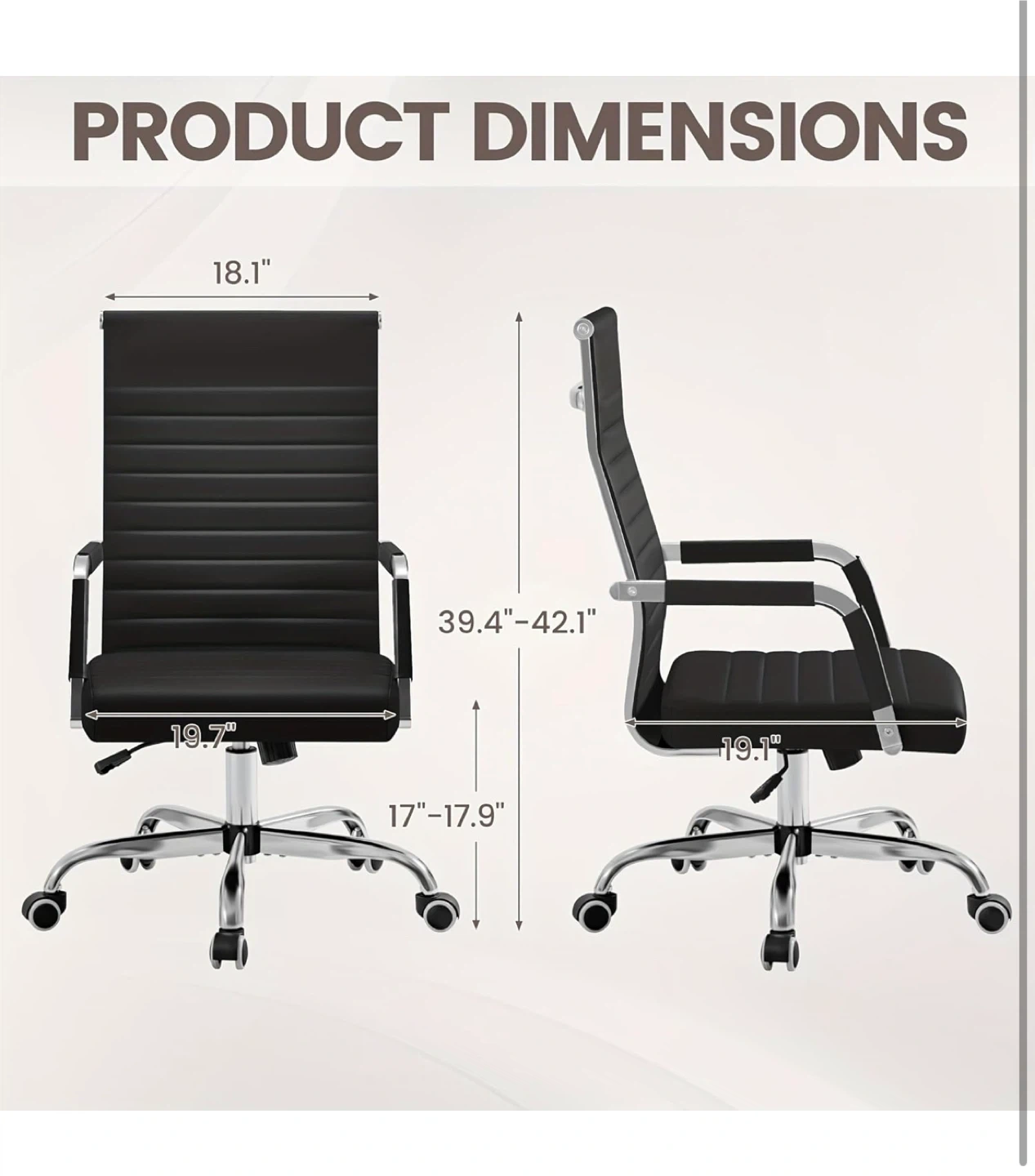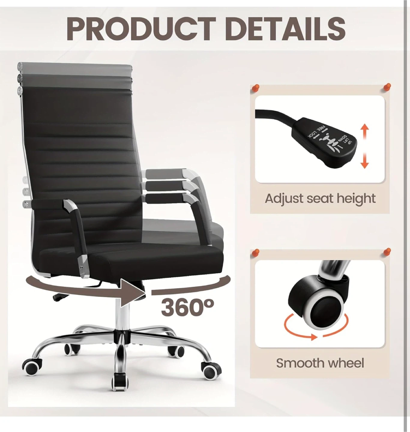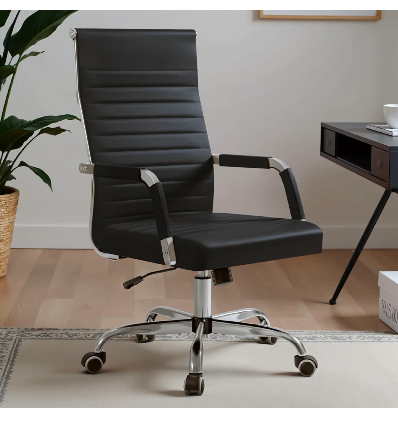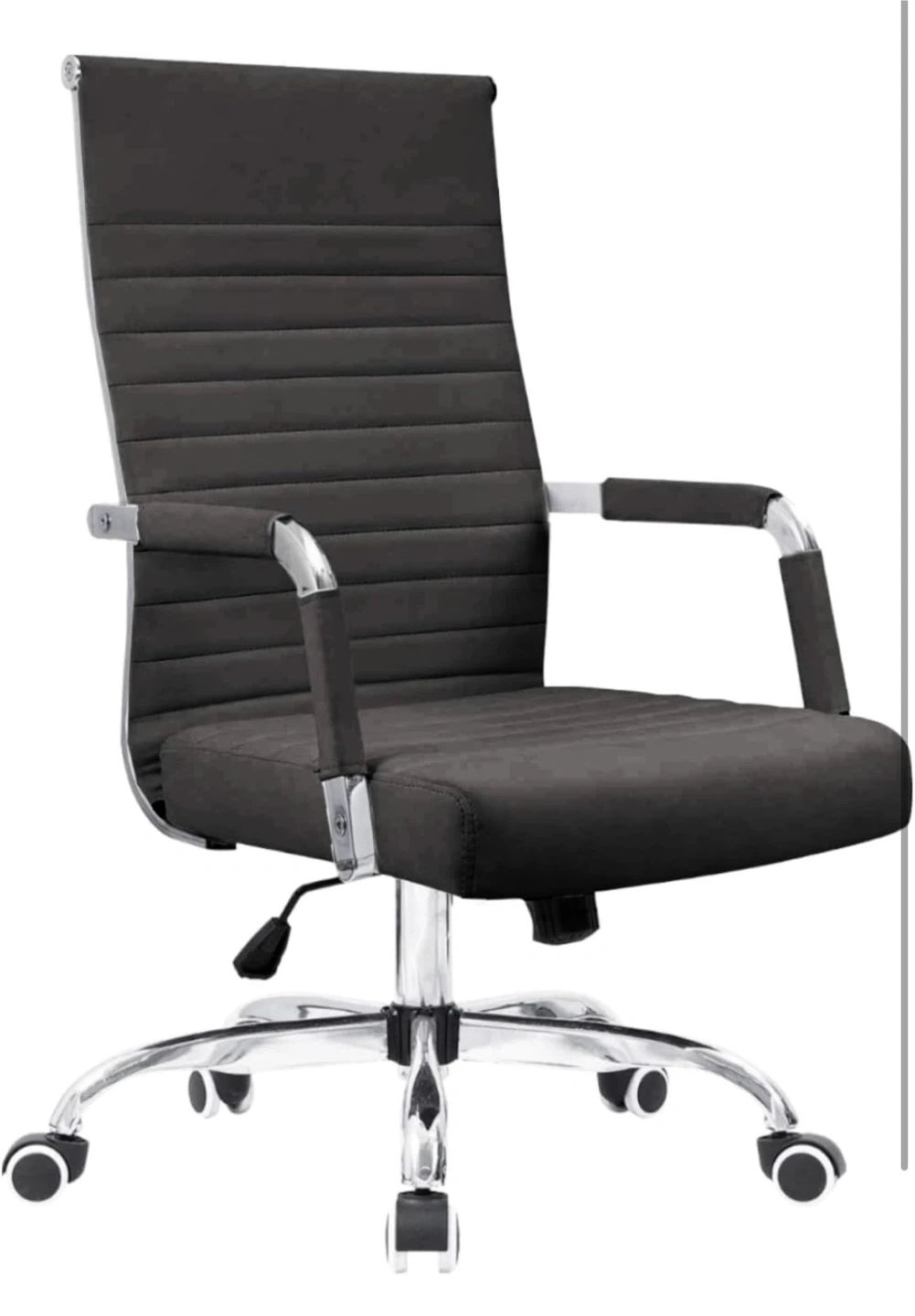 This office chair features a high back design for added support and comfort. It's upholstered in black faux leather with sleek chrome accents and a smooth-rolling wheel base. The seat height is adjustable to suit your needs