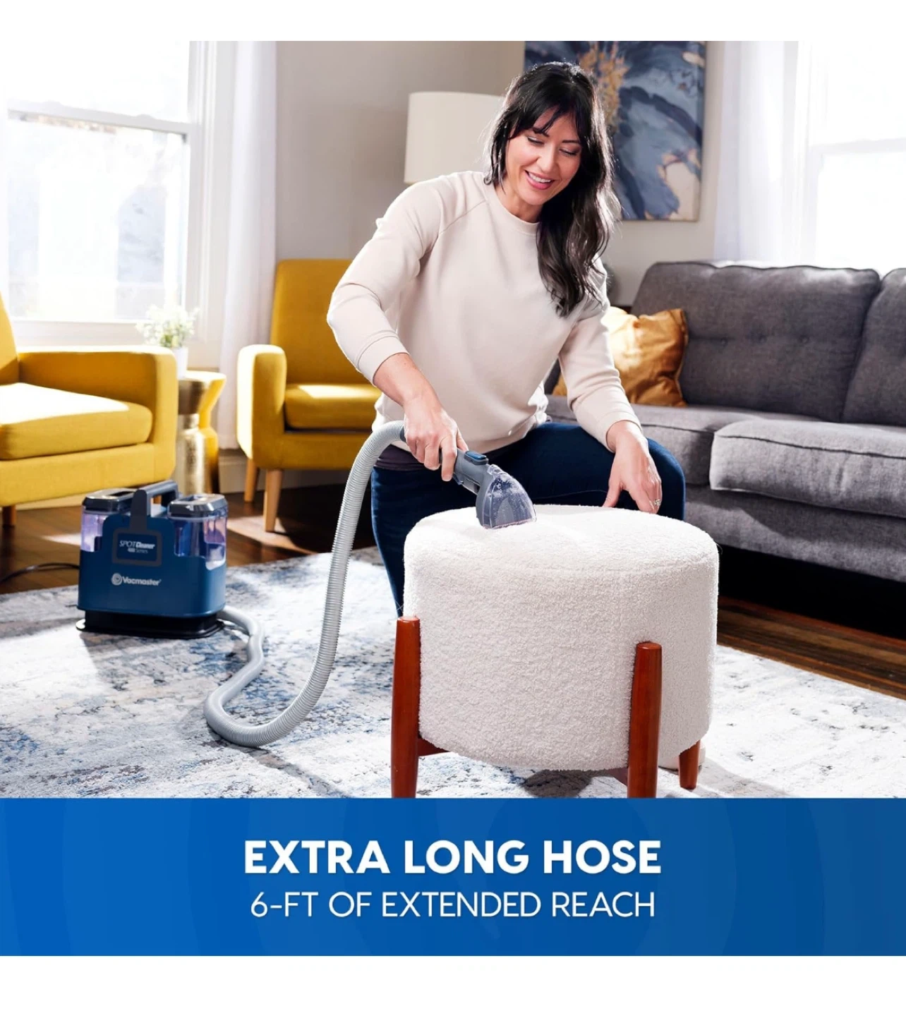 This Vacmaster SPOT Cleaner 400 Series is designed for powerful stain removal on carpets, rugs, and furniture. It features a portable design perfect for tackling spills and accidents in car interiors. The unit also boasts compact storage, easily fitting into a cabinet or closet, and includes an extra-long 6-ft hose for extended reach.