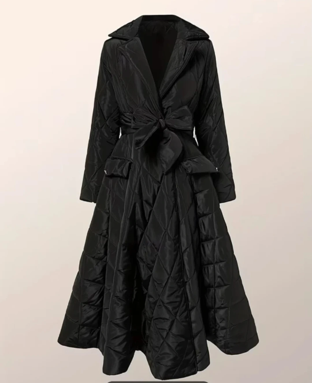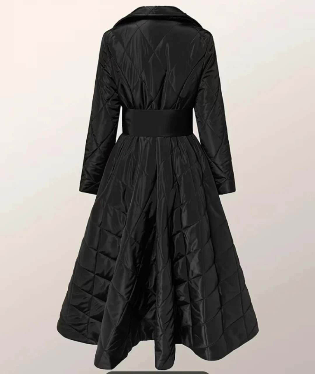 New stylish black coat features a quilted design throughout. It has a flattering wide collar and a matching belt to cinch the waist. The full skirt adds a dramatic flair! Material is satin.