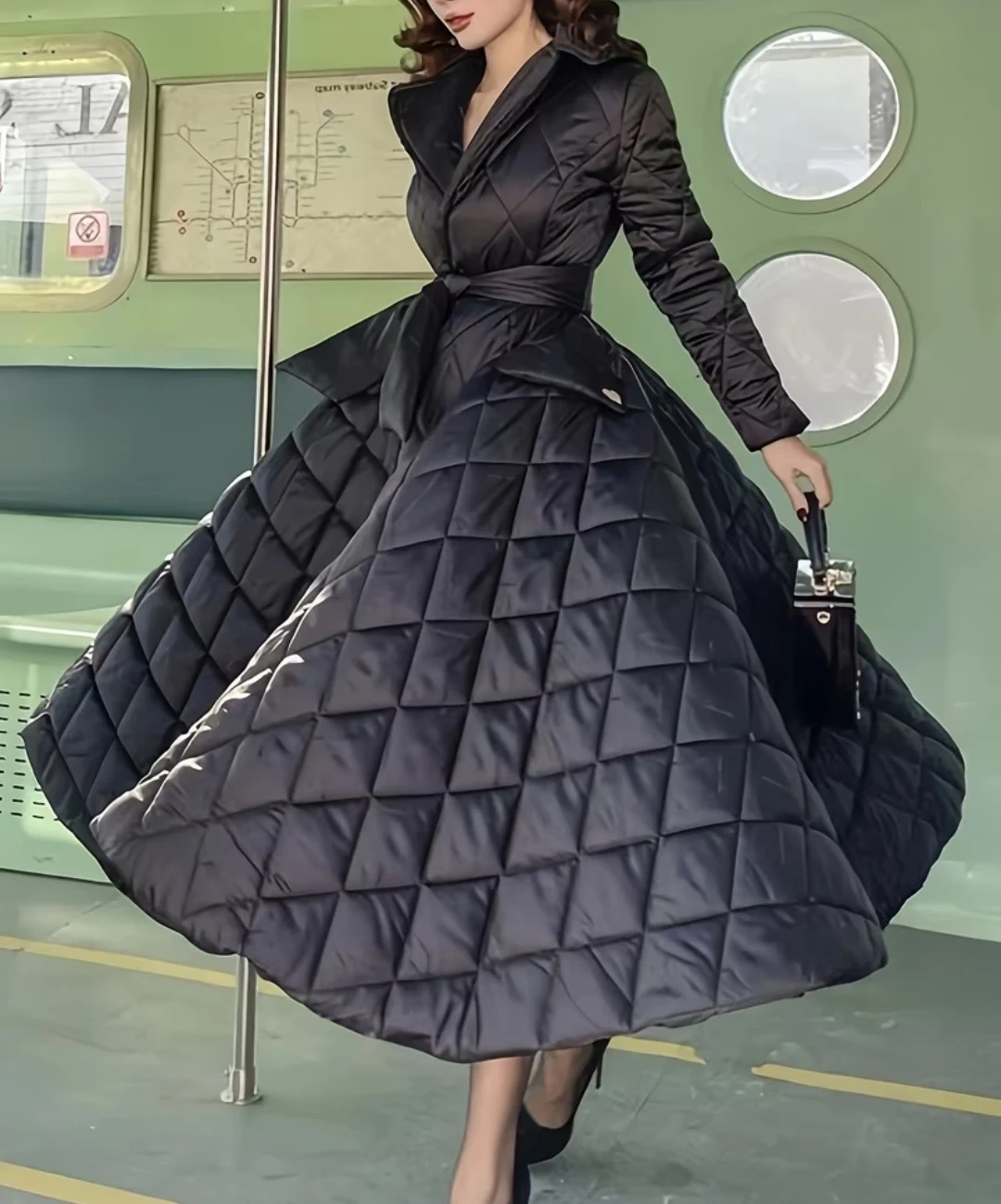 New stylish black coat features a quilted design throughout. It has a flattering wide collar and a matching belt to cinch the waist. The full skirt adds a dramatic flair! Material is satin.