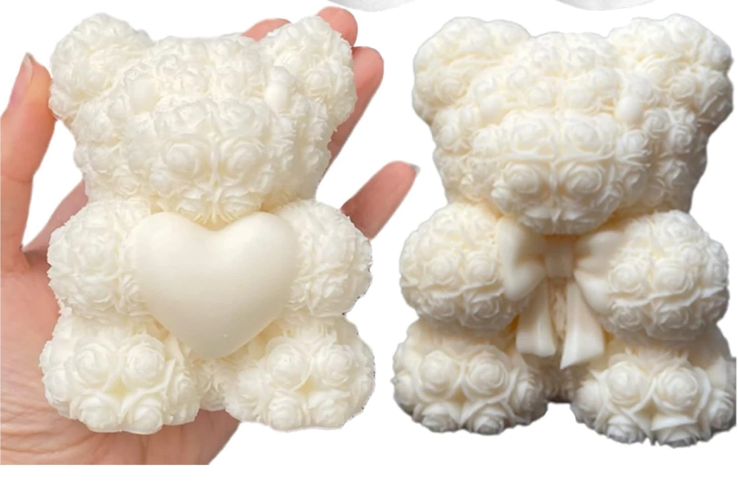 Cute bear candles, perfect for baby shower favors. Each candle is individually wrapped in a clear bag with a gold and white 'Thank You!' tag. Bear has a lovely rose texture. Some bears have a heart on the chest, others a bow. Great little gifts for guests.