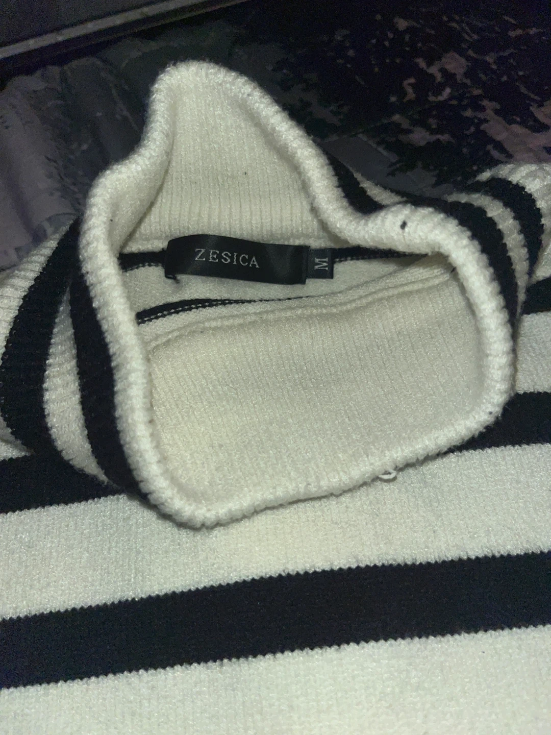 This is a black and white striped sweater from Zesica. It has a mock neck and ribbed cuffs and hem. Size medium.worn once and don’t like the style on myself pick up