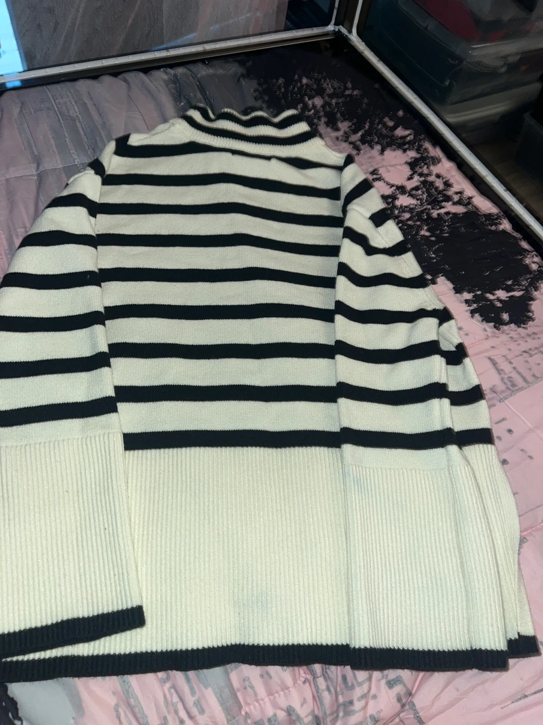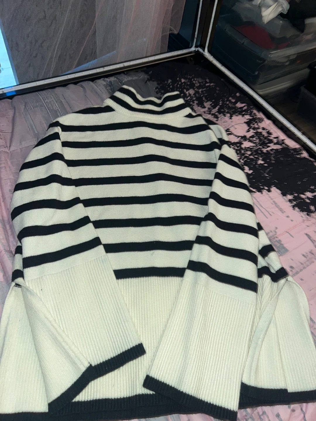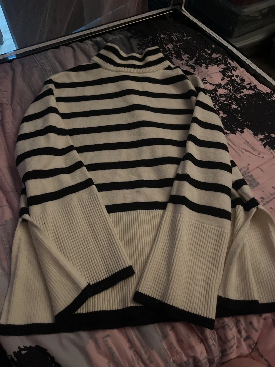 This is a black and white striped sweater from Zesica. It has a mock neck and ribbed cuffs and hem. Size medium.worn once and don’t like the style on myself pick up