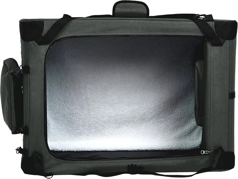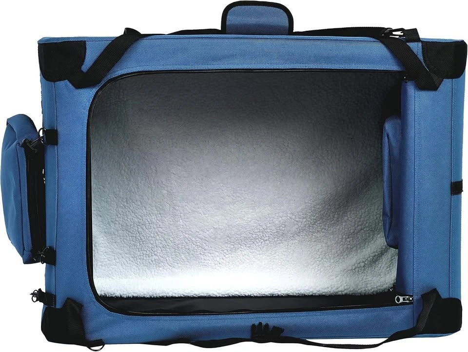 Soft-sided carrier crate for pets that collapses easily for storage. Made with durable polyester and PVC material. Well-ventilated with multiple screened panels for your pet to look out of. Includes plush fleece-covered pet bed for comfort while on the road. Accessory pockets on the top and sides for storing treats, toys, and more.