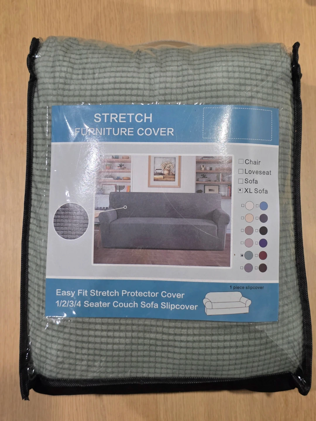 Easy fit stretch furniture cover designed for sofas. Fabric content is 85% Polyester, 15% Spandex. Machine washable for easy care.