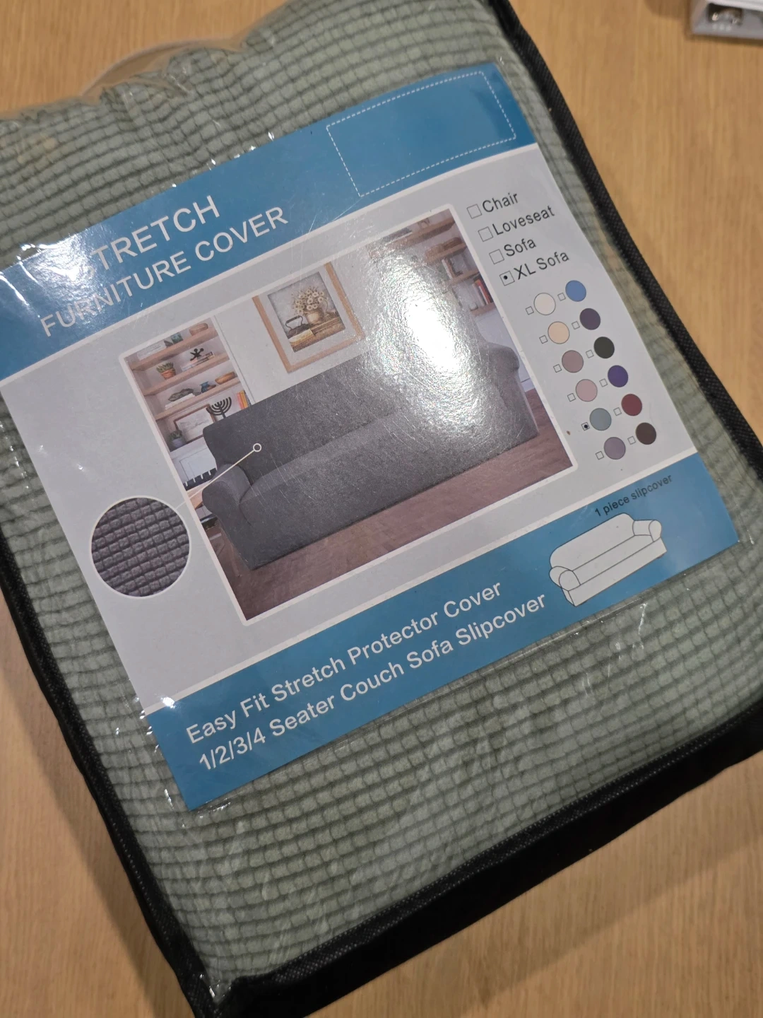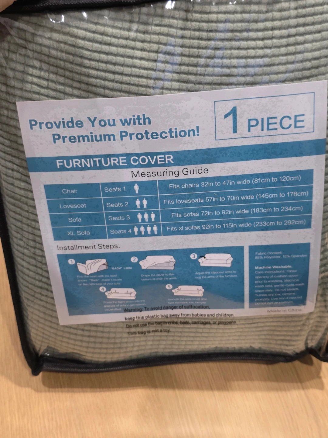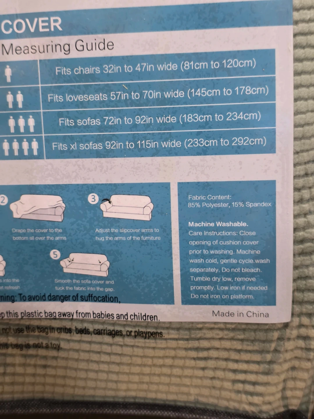 Easy fit stretch furniture cover designed for sofas. Fabric content is 85% Polyester, 15% Spandex. Machine washable for easy care.