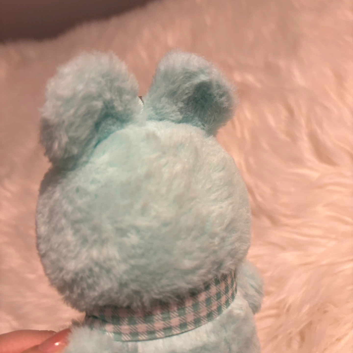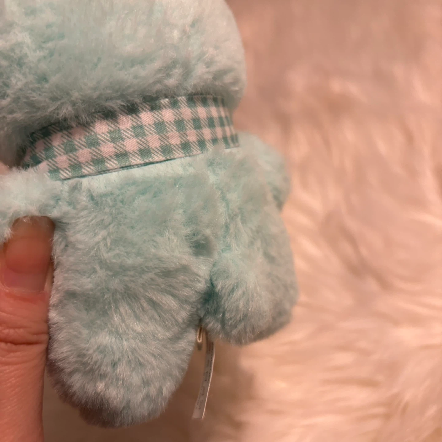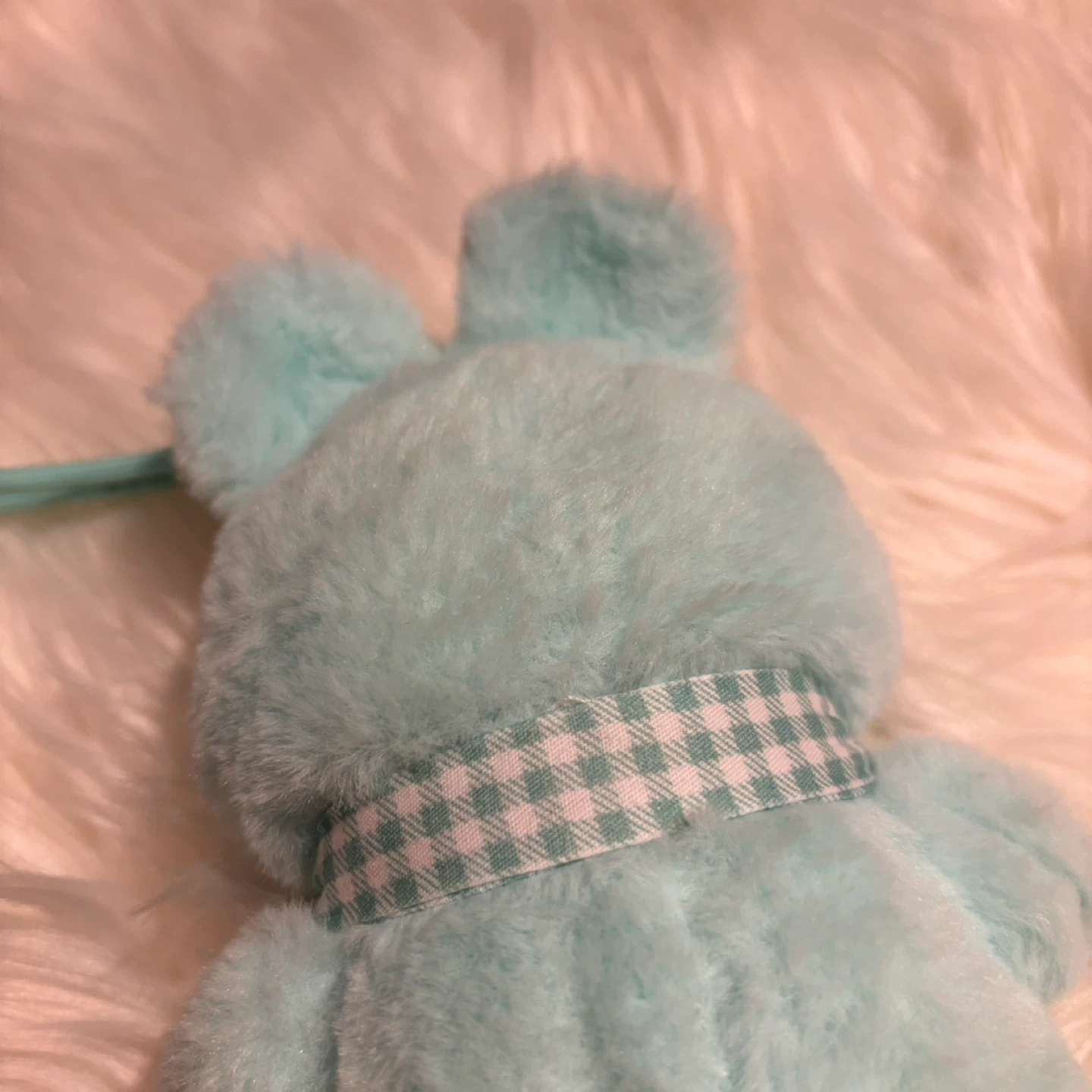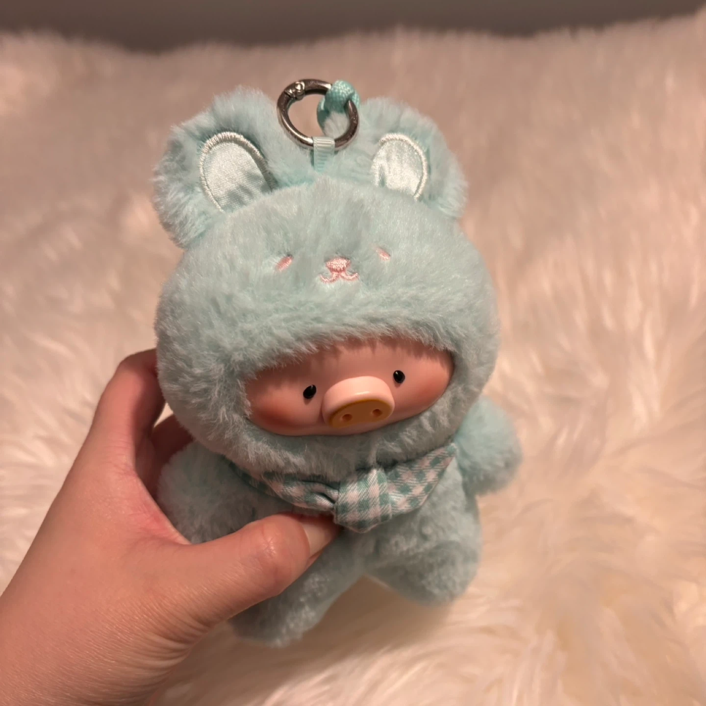 Super cute aqua-coloured plush charm featuring a pig character in a bunny suit. It has a little gingham scarf tied around its neck and a loop for hanging. Soft and fuzzy material!