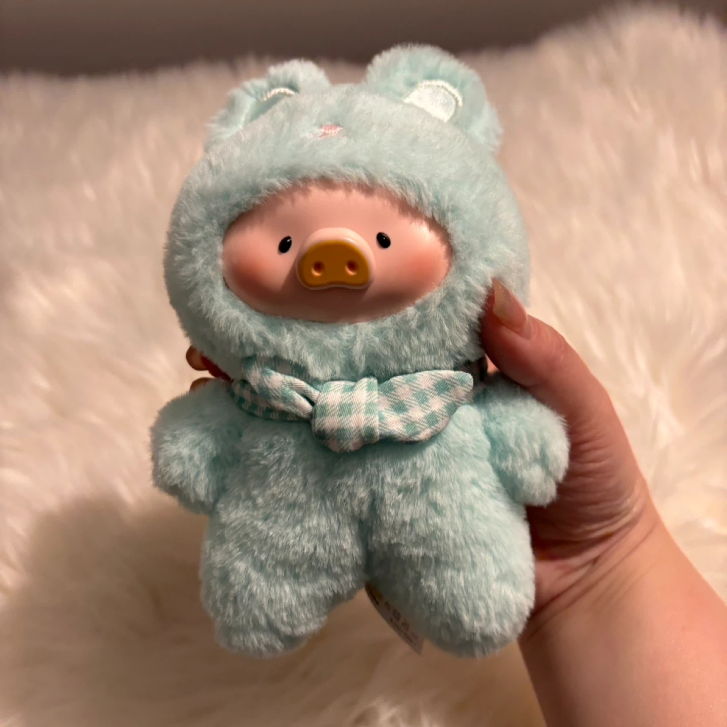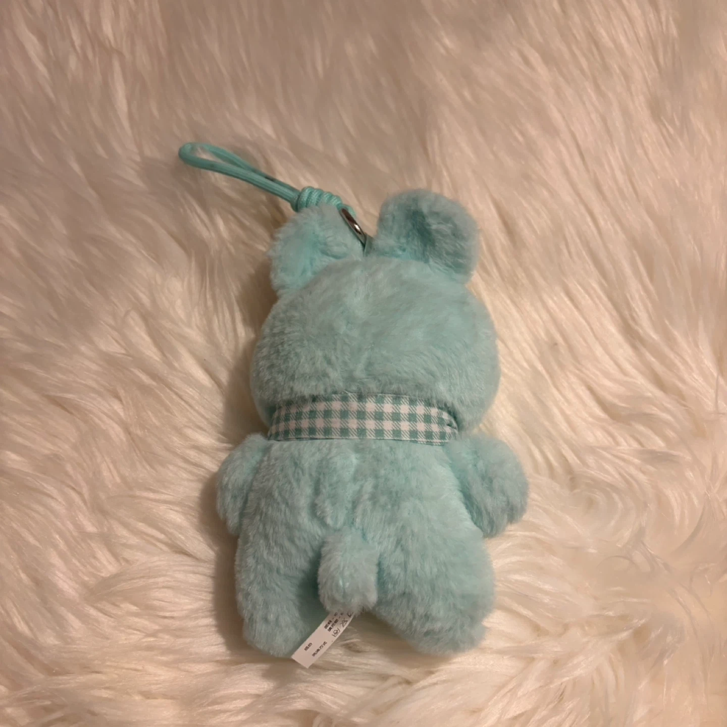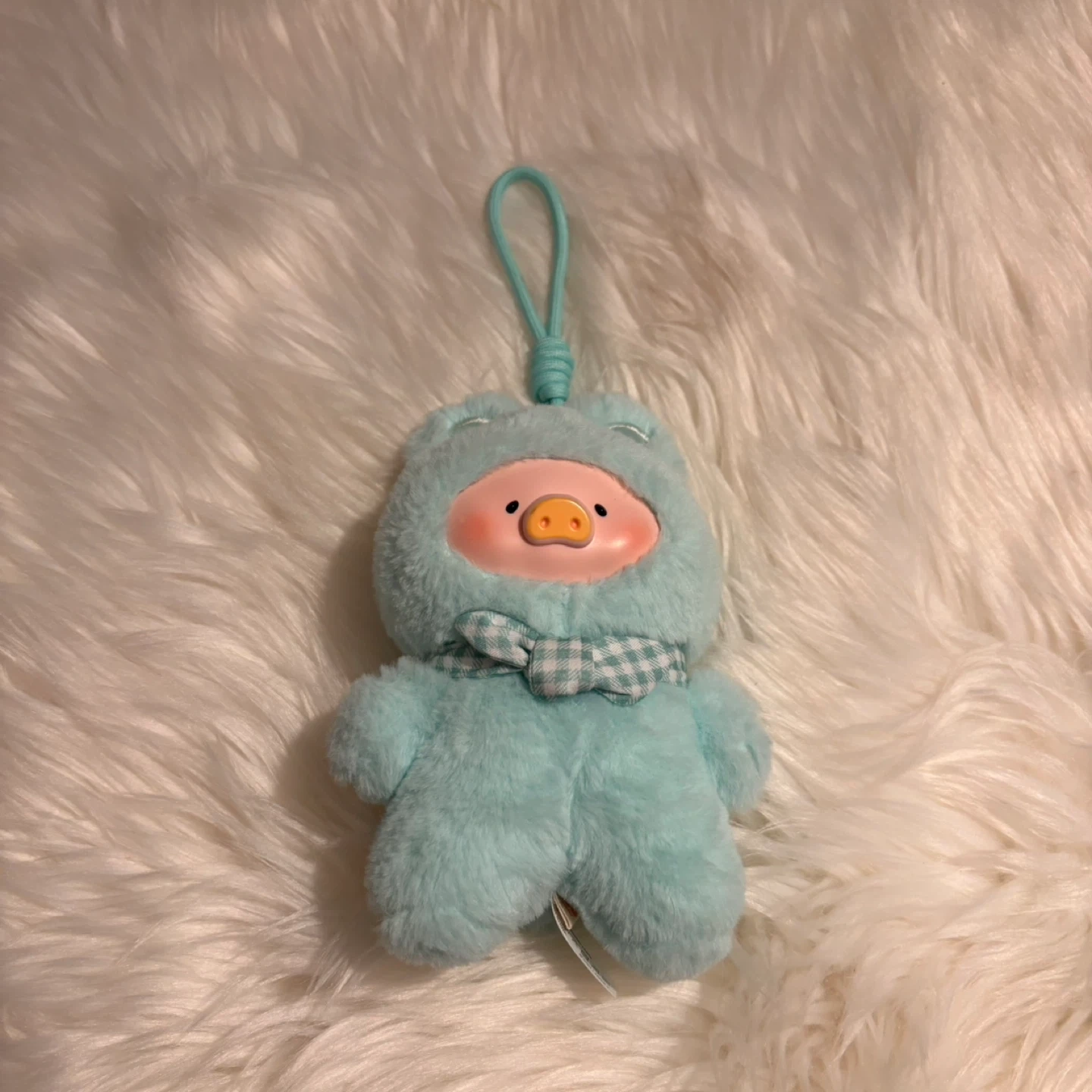 Super cute aqua-coloured plush charm featuring a pig character in a bunny suit. It has a little gingham scarf tied around its neck and a loop for hanging. Soft and fuzzy material!