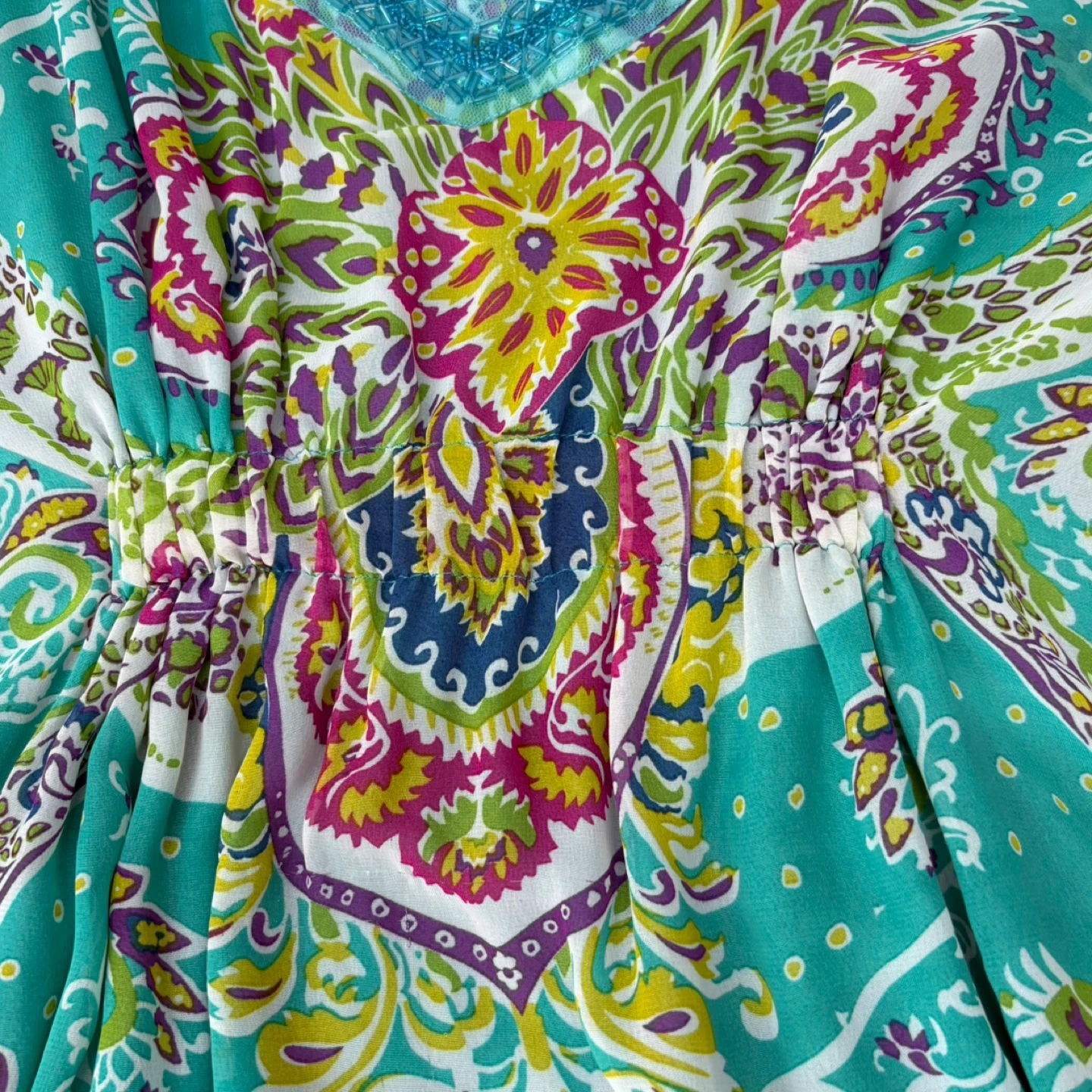 Embrace effortless bohemian style with this stunning Jolie flowy dress. This vibrant piece features an intricate paisley print in shades of turquoise, lime green, and magenta, perfectly complemented by delicate blue beading and sequins along the V-neckline. The flattering silhouette is gathered with an elastic empire waist under the bust to create a comfortable, feminine shape. Fully lined for coverage, this lightweight dress is perfect for summer festivals, vacations, or brunch.