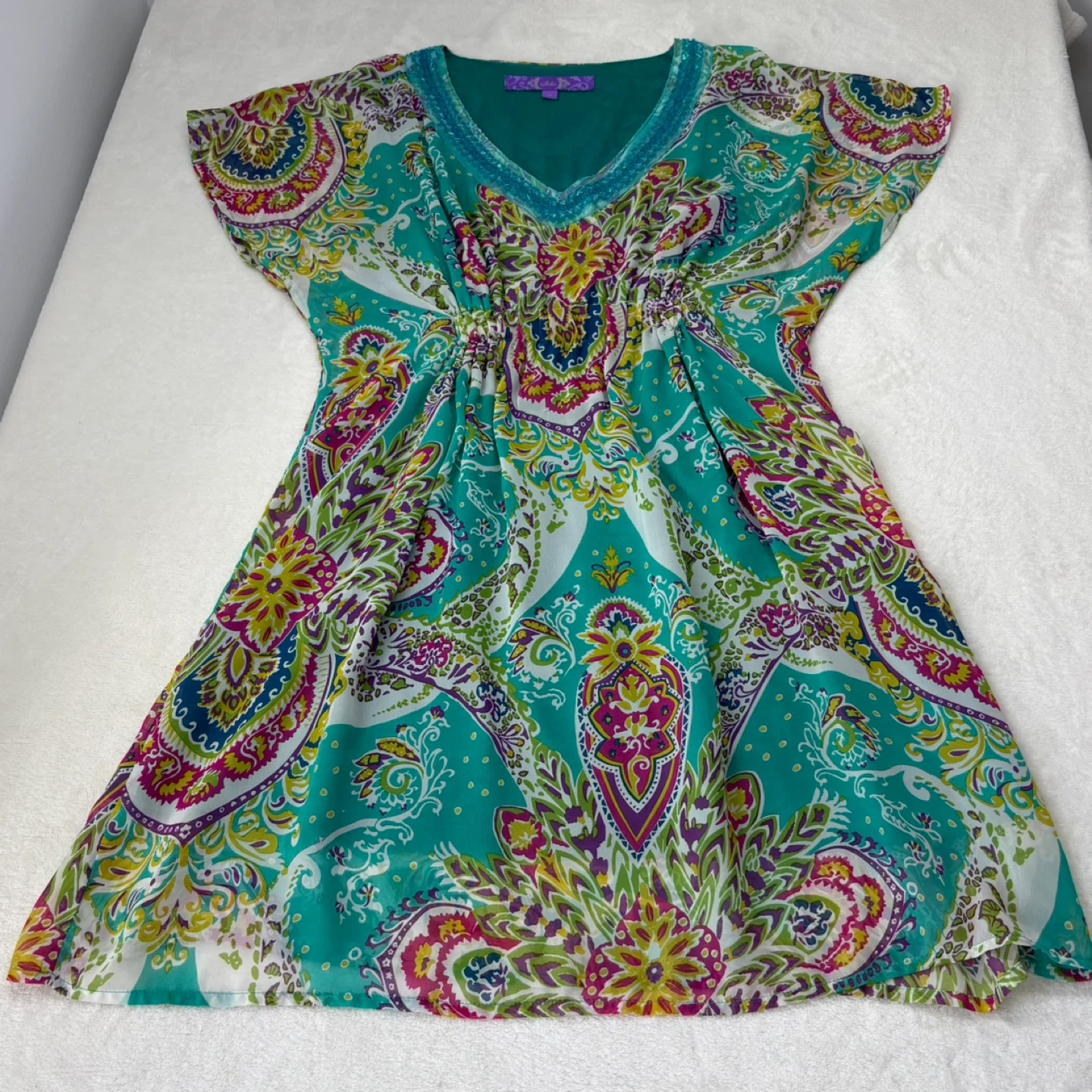 Jolie dress, boho style, paisley print, beaded neckline, flowy dress, empire waist, turquoise dress, summer fashion, festival wear, beaded dress, size 12, whimsical, feminine, colorful dress, lined mini dress.