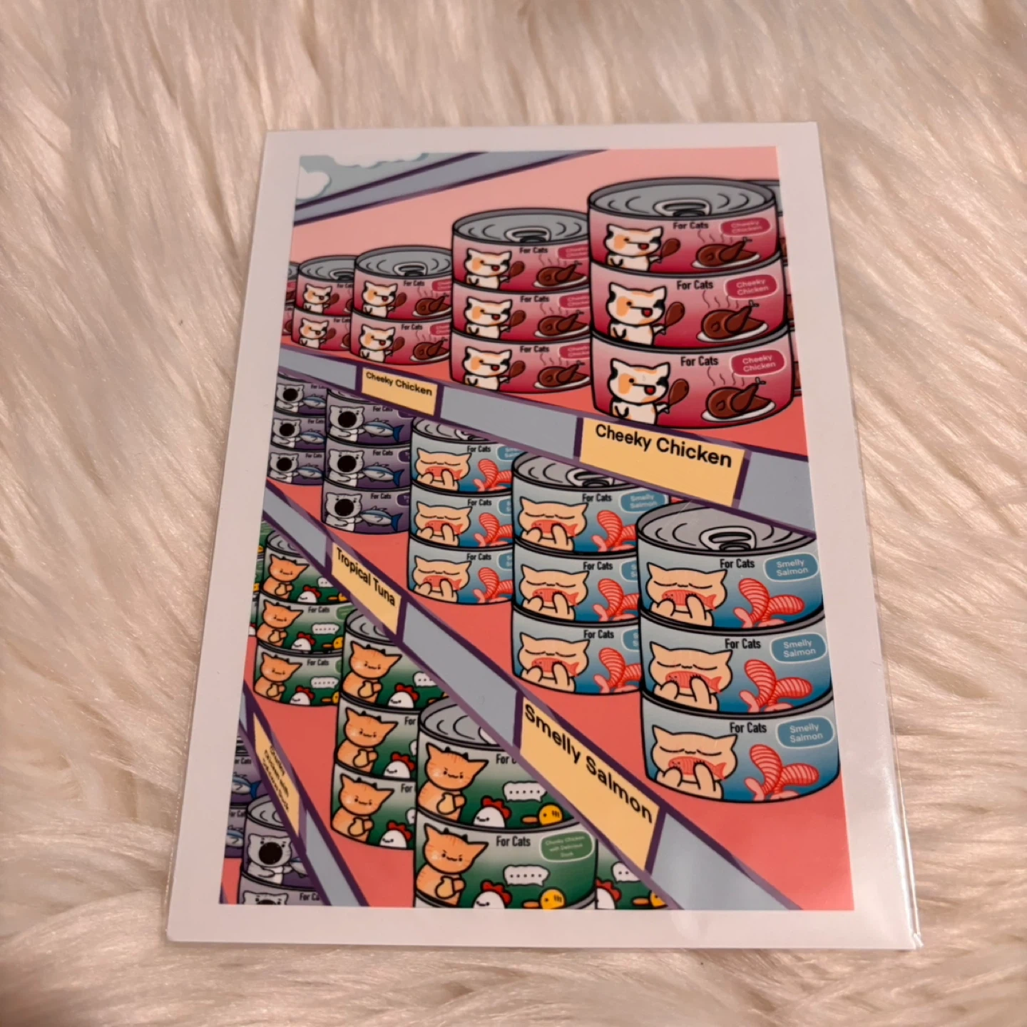 This is a matte print featuring a whimsical illustration of shelves stocked with cans of cat food in various cartoon flavours like 'Cheeky Chicken' and 'Smelly Salmon'. It's designed to bring a smile to any cat lover's face! This print would make a fun addition to a home office or a kitchen.