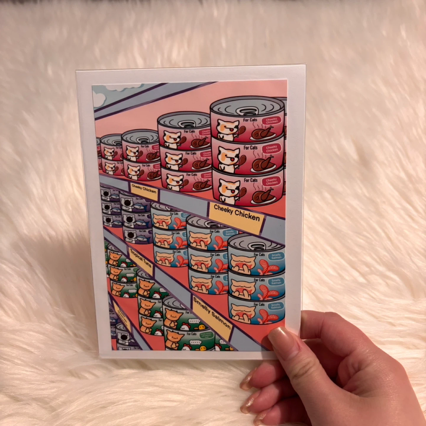 This is a matte print featuring a whimsical illustration of shelves stocked with cans of cat food in various cartoon flavours like 'Cheeky Chicken' and 'Smelly Salmon'. It's designed to bring a smile to any cat lover's face! This print would make a fun addition to a home office or a kitchen.