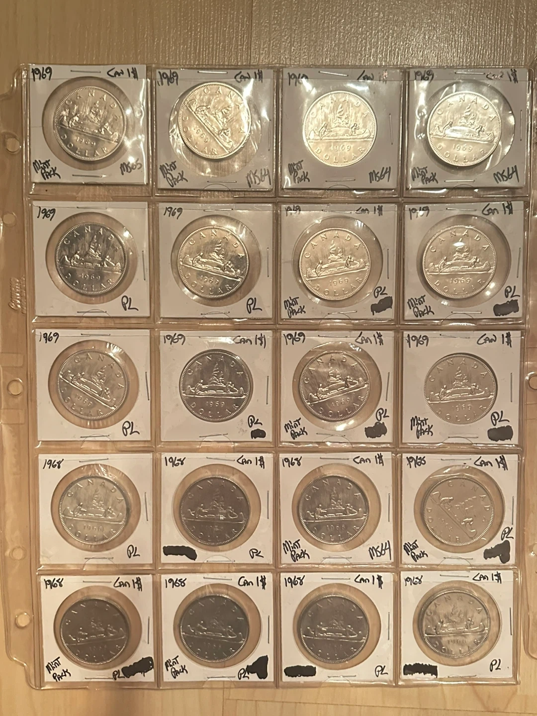 This is a collection of various Canadian coins, mostly from the late 1960s and early 1970s. Some coins are dated 1968, 1969, 1970, 1982, 1984, and 1986. Many are labelled 'Mint Pack' or 'Proof Like'. This collection would appeal to coin enthusiasts and collectors interested in Canadian numismatics.