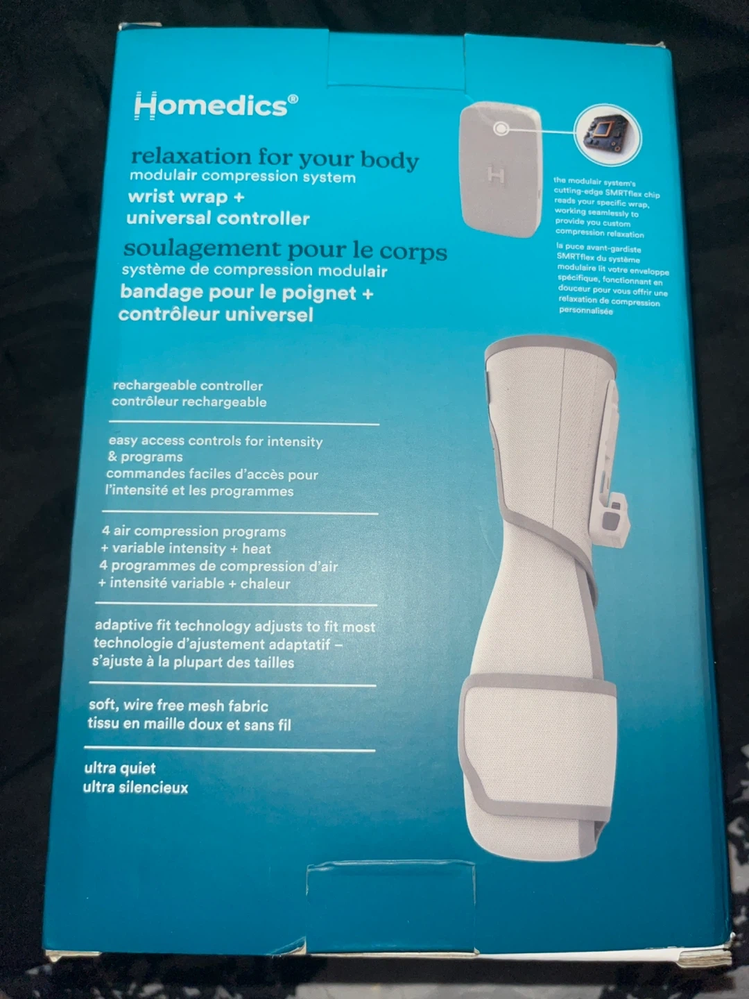 This HoMedics Modulair compression system includes a wrist wrap and a universal controller. It offers 4 air compression programs with variable intensity and heat. The wrap is made from soft, wire-free mesh fabric and is cordless and portable. This is great for targeted relaxation and muscle relief!