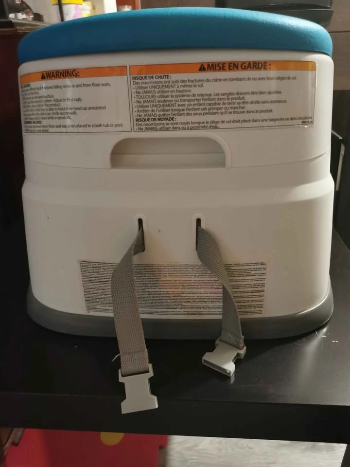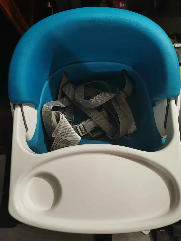 Clean Ingenuity baby booster seat. White and blue color. Has a removable tray and safety straps. Great for feeding time or just keeping little one secure.
