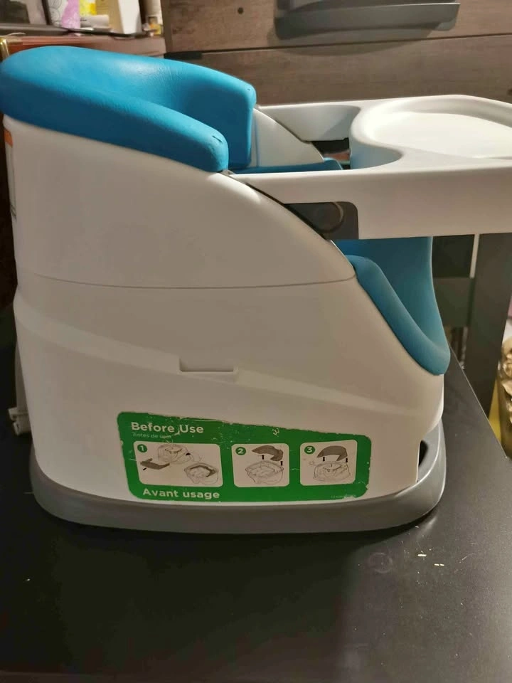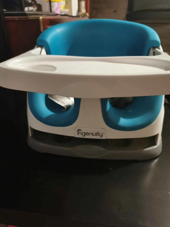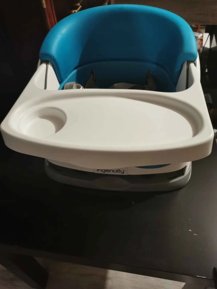 Clean Ingenuity baby booster seat. White and blue color. Has a removable tray and safety straps. Great for feeding time or just keeping little one secure.
