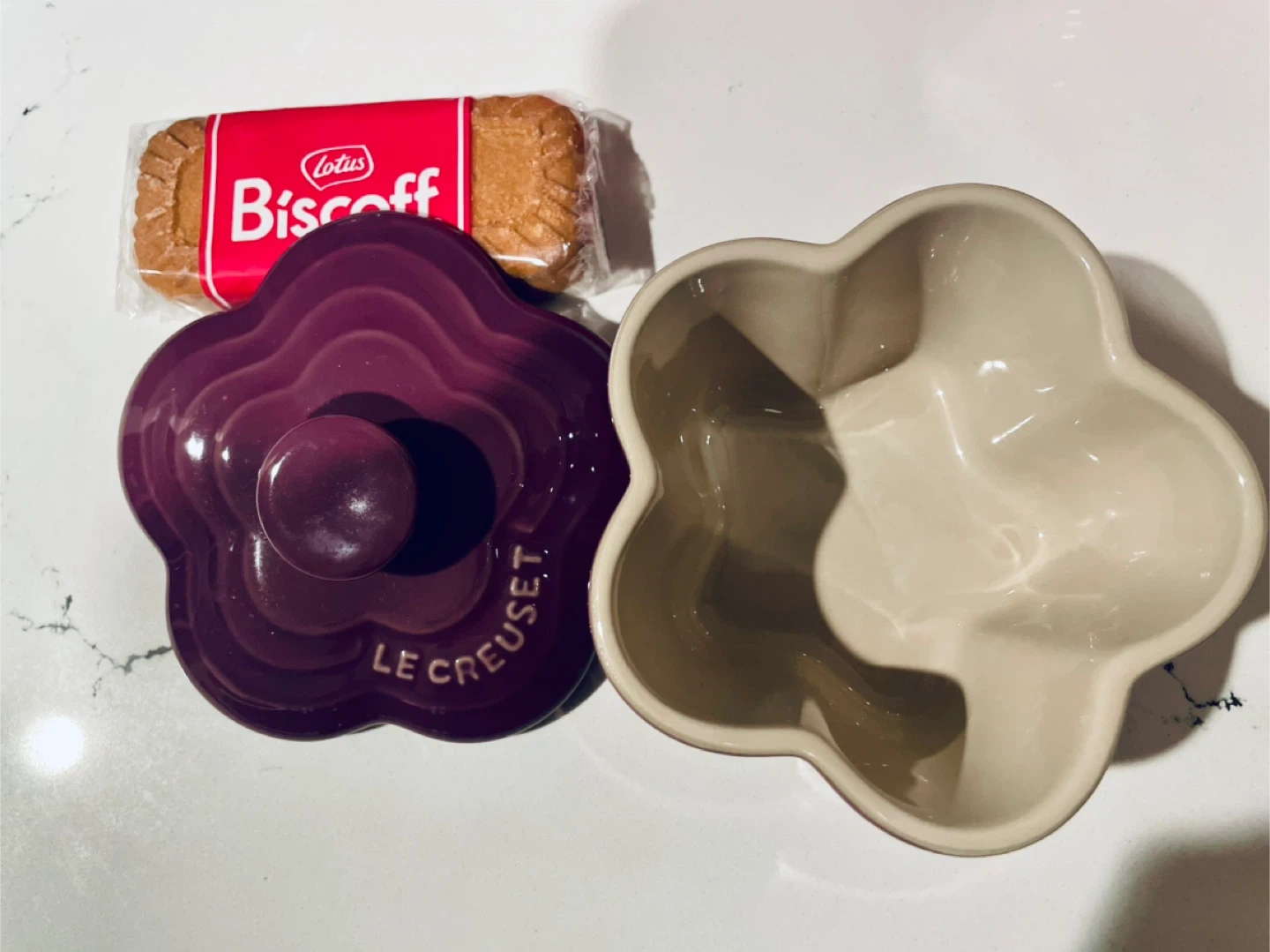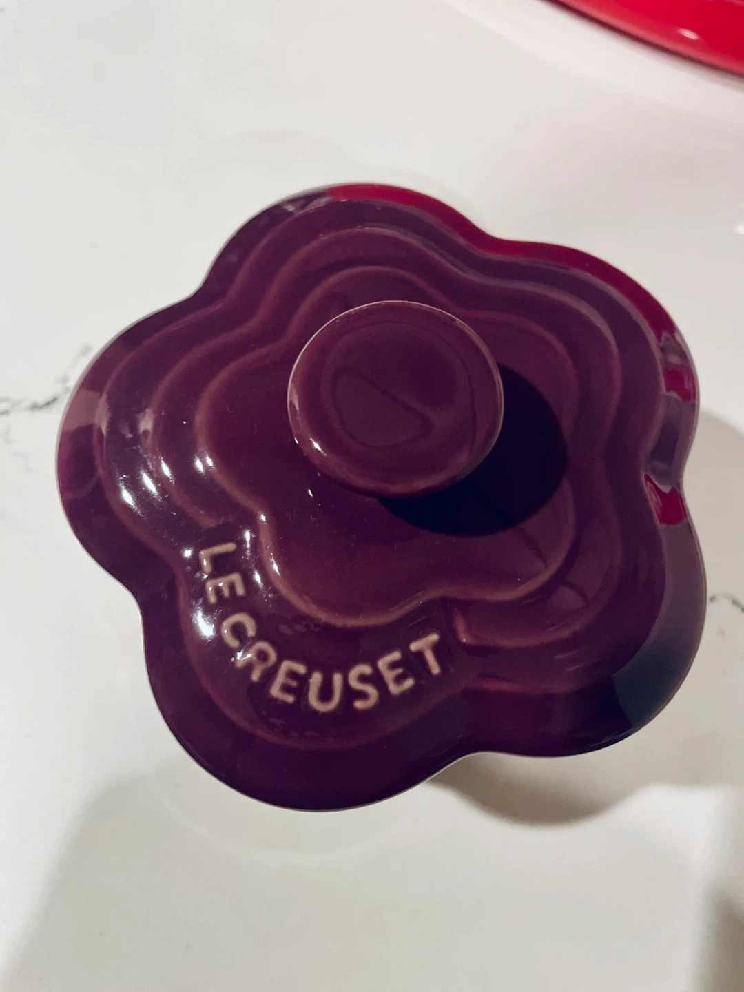 This is a Le Creuset flower-shaped ramekin dish in a deep plum colour. It's made of stoneware and includes a lid. Perfect for serving individual desserts or dips!