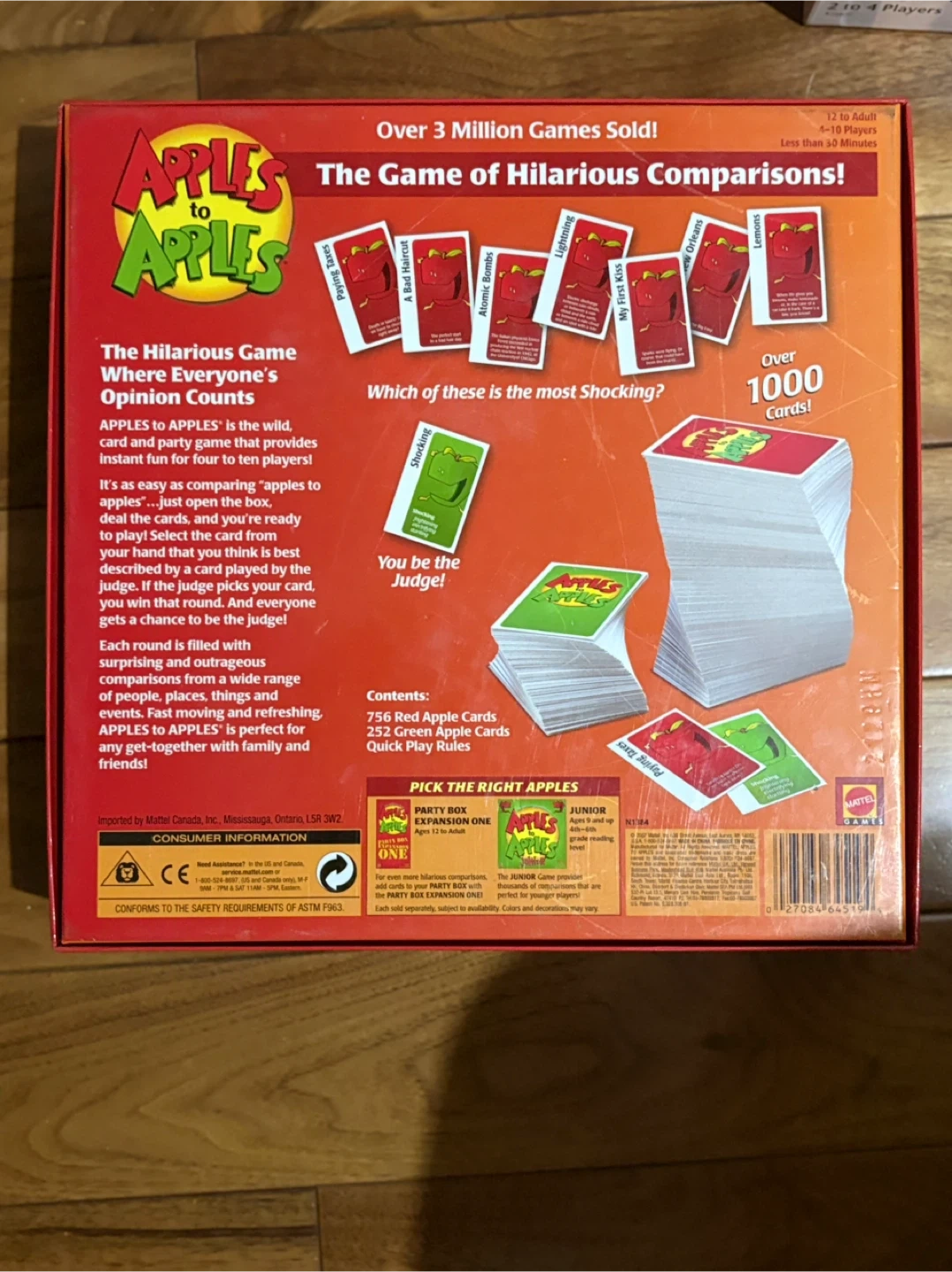 Apples to Apples is a wild card and party game that provides instant fun. It's easy to compare 'apples to apples' with the hilarious comparisons. Includes 252 Green Apple Cards and 50 Red Apple Cards.