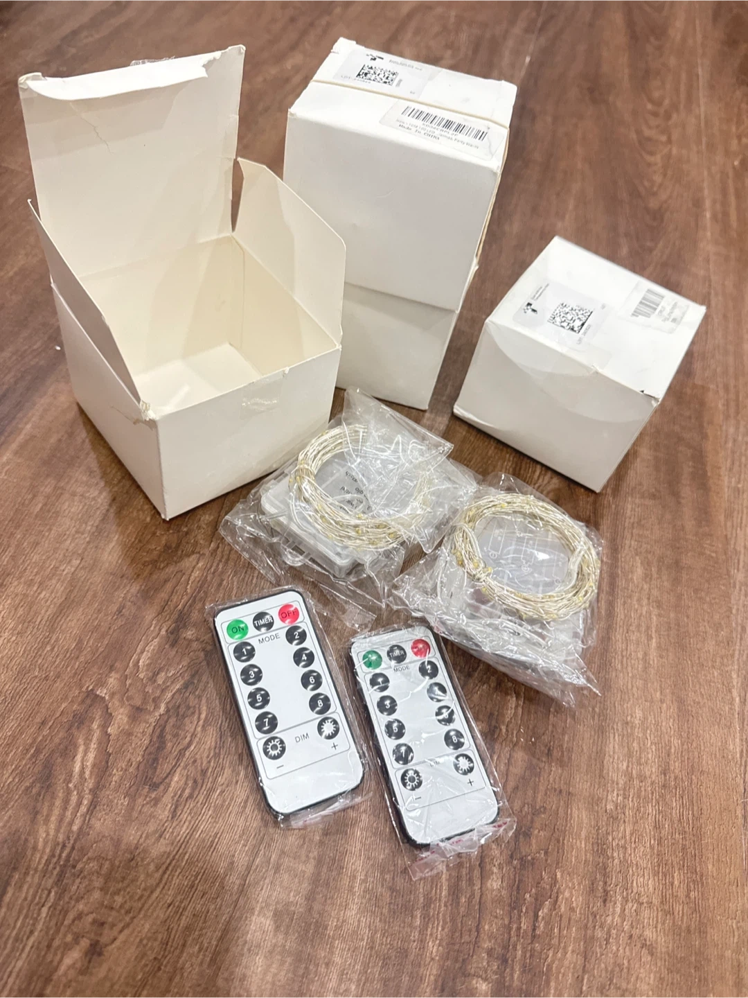 Includes two 10-meter strings of LED fairy lights, each with 100 LEDs. Both come with individual remote controls offering multiple modes and brightness settings. Battery boxes are included for power. Great for decorating tents, rooms, or outdoor spaces!