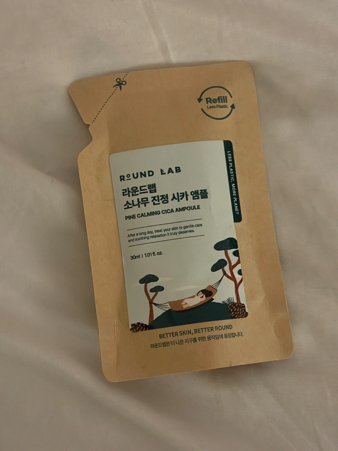 From korea This is a 30ml bottle of Round Lab Pine Calming Cica Ampoule. It's designed for gentle skin care and soothing relaxation.