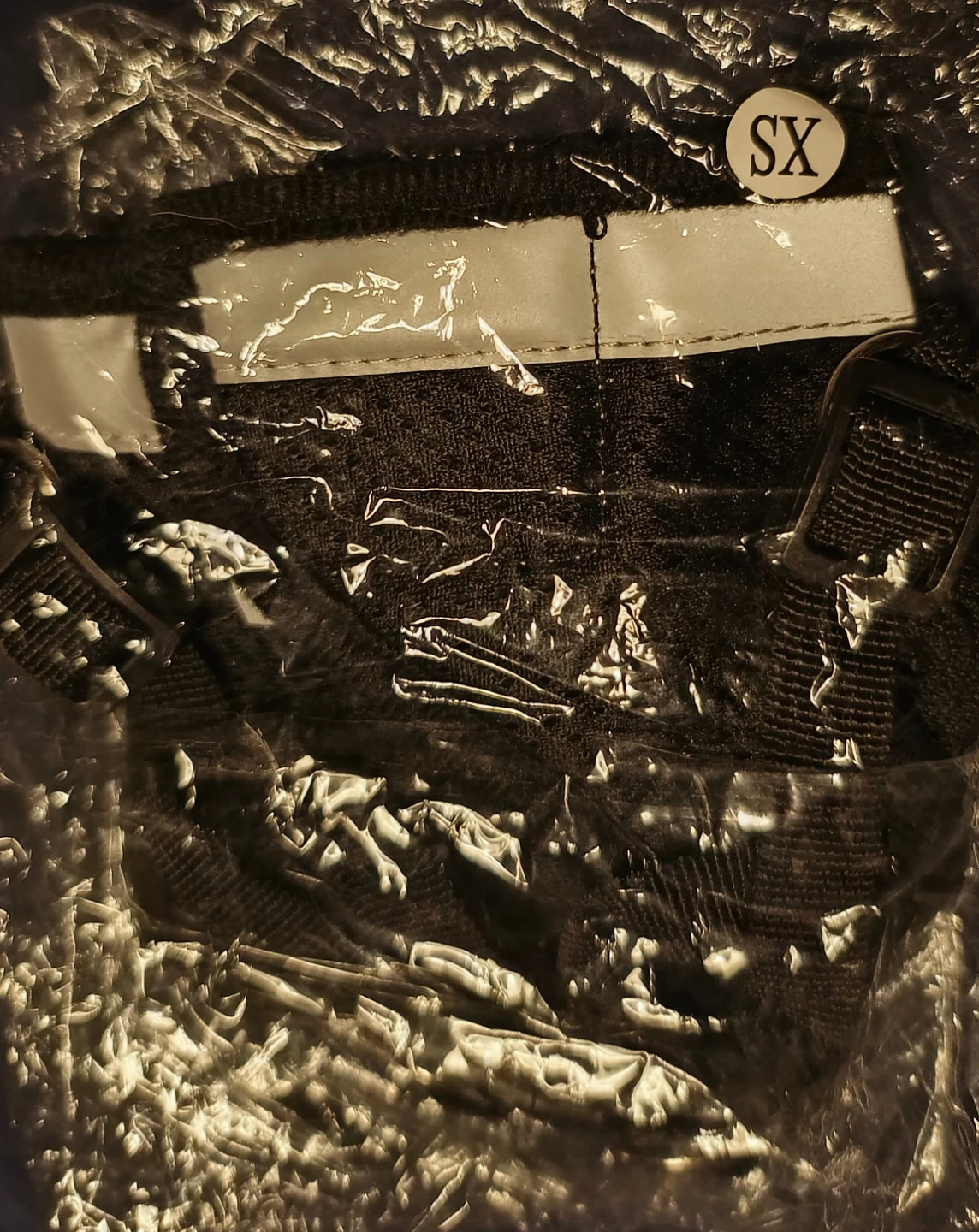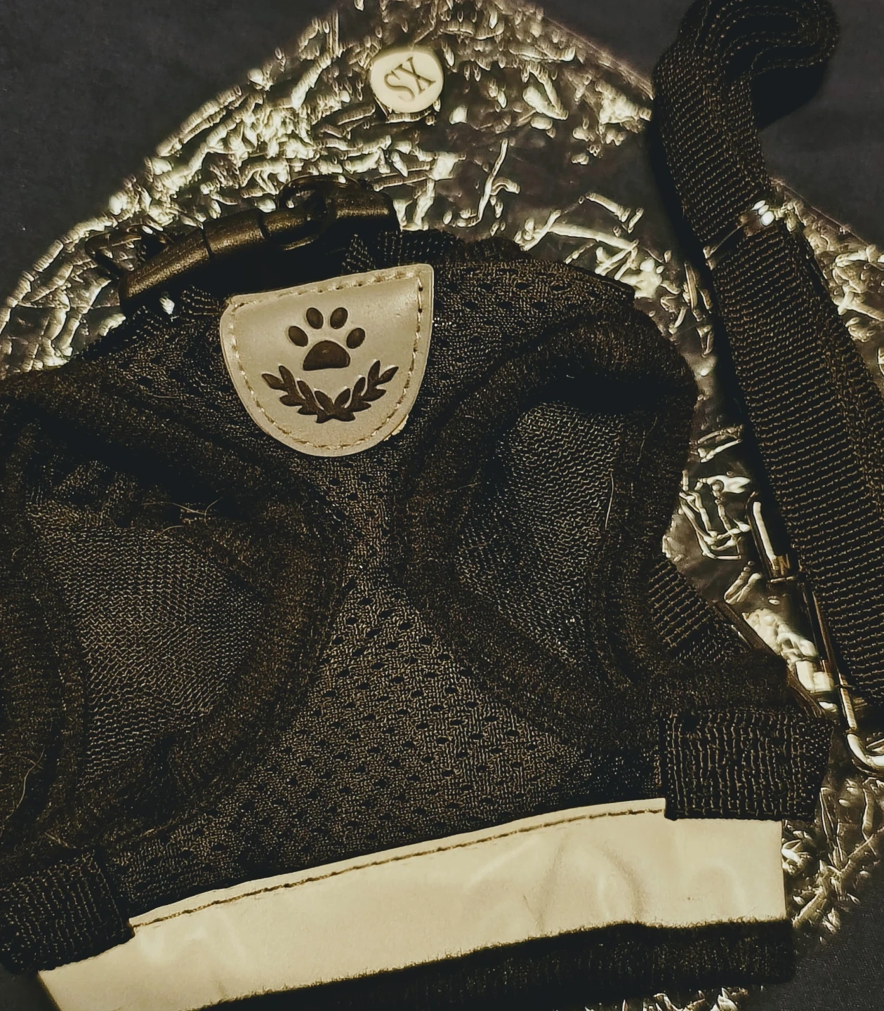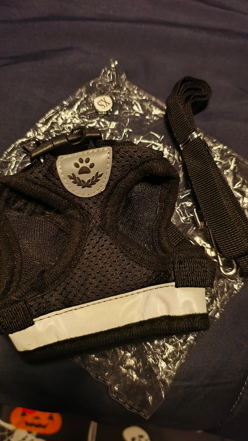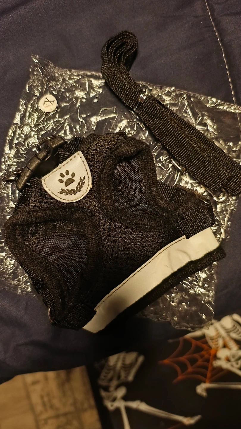 This is an extra small black mesh pet harness. It comes with a matching leash and features a reflective strip for visibility. It's suitable for small dogs or cats. Great for walks!