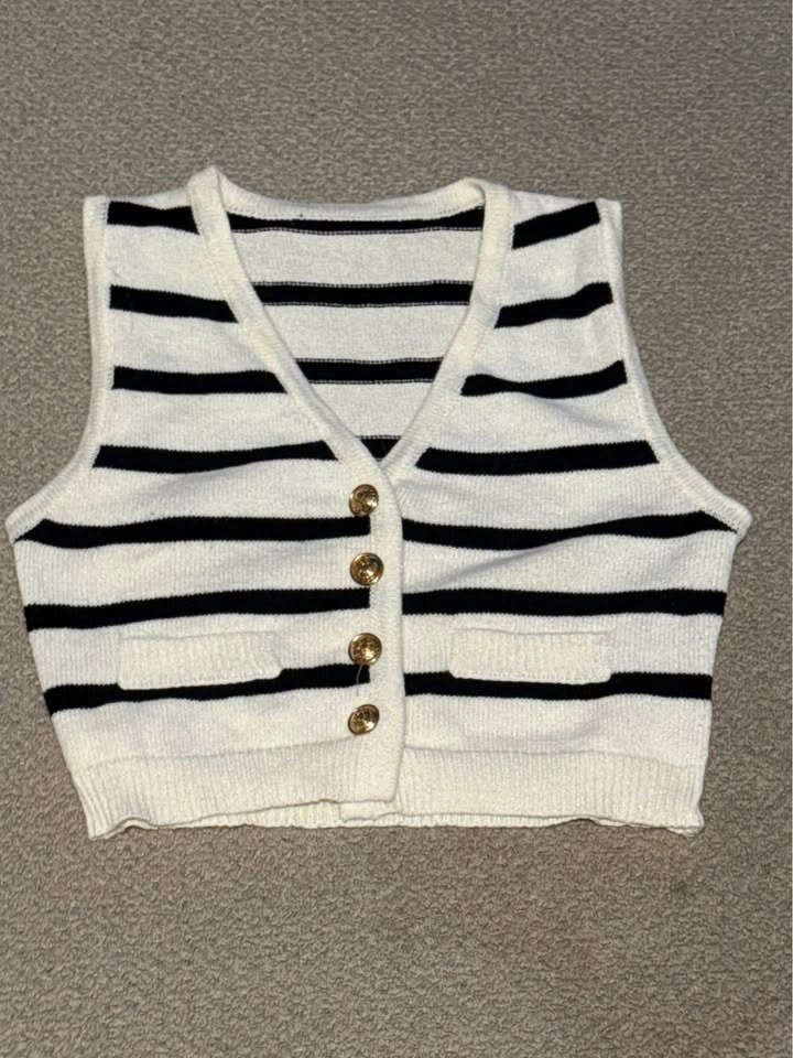 Black and white striped knit vest. Size Medium. Cropped fit — cute with high-waisted jeans or skirts. Good condition. Smoke free home. Pickup in Abbotsford, Mount Lehman Area.
