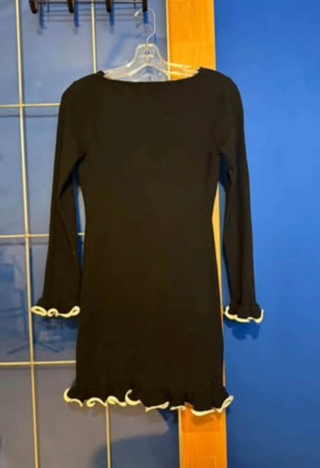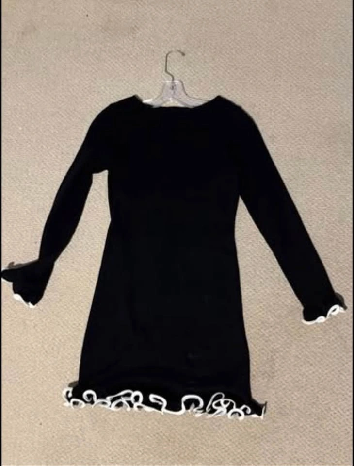 Black Long Sleeve Mini Dress with White Trim – Size 8/10