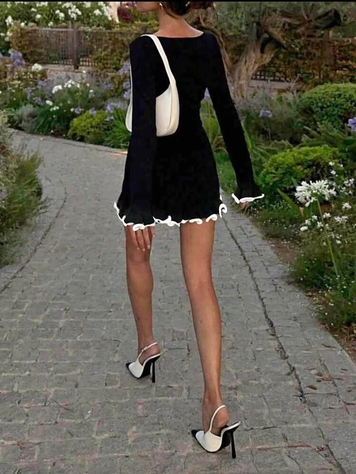 Black Long Sleeve Mini Dress with White Trim – Size 8/10