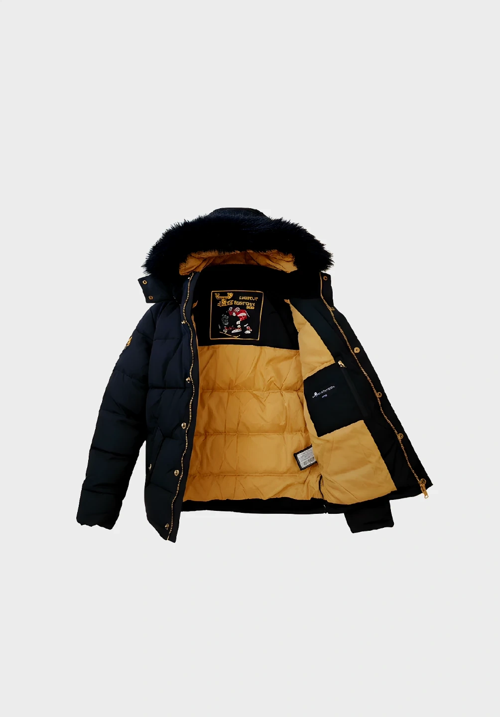 This Moose Knuckles jacket is black with a yellow interior lining. It features a fur-trimmed hood and gold-tone hardware, including zippers on the sleeves and front closure. It's insulated for warmth and designed for cold weather.