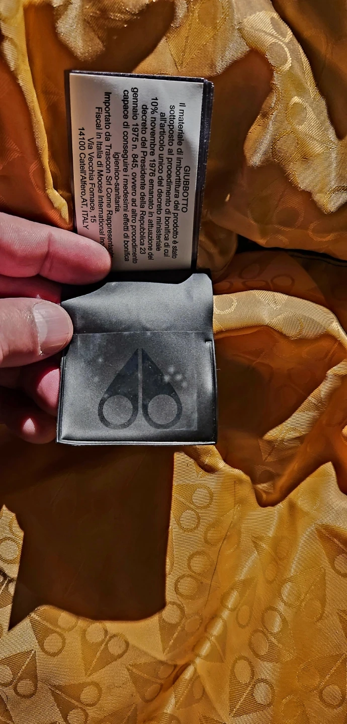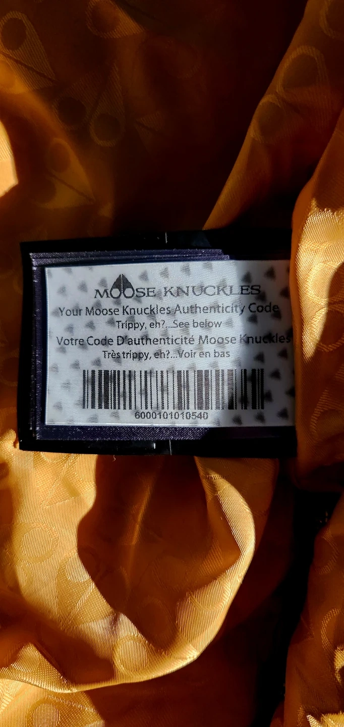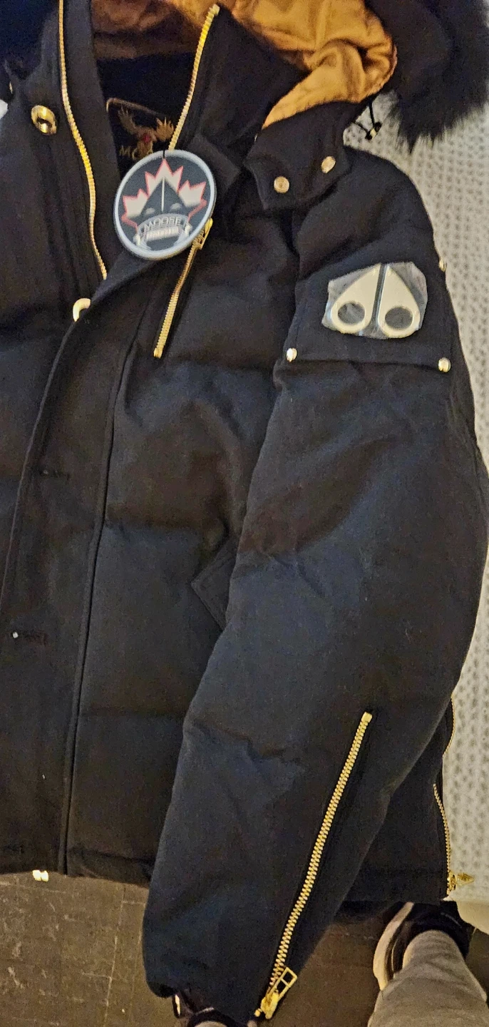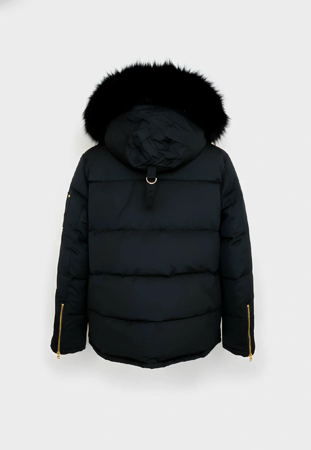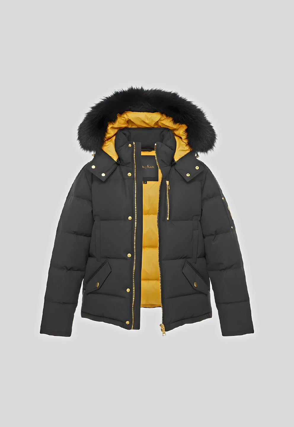This Moose Knuckles jacket is black with a yellow interior lining. It features a fur-trimmed hood and gold-tone hardware, including zippers on the sleeves and front closure. It's insulated for warmth and designed for cold weather.